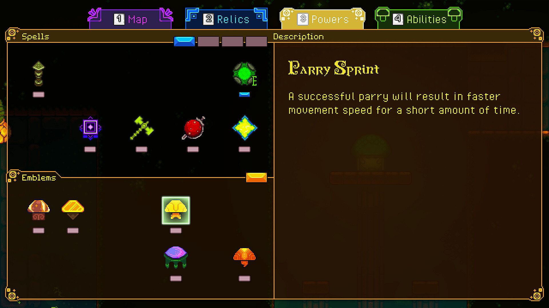 In addition to Emblems, there are Relics that work very similarly to the Charm system in Hollow Knight. Some change how your healing works and others increase your sword damage or give you additional protection. There are 60 Relics in the game and you choose what your strengths will be through the Relics. You can make some really specialized builds focusing on defense, healing, speed, melee attacking, or spell-casting!