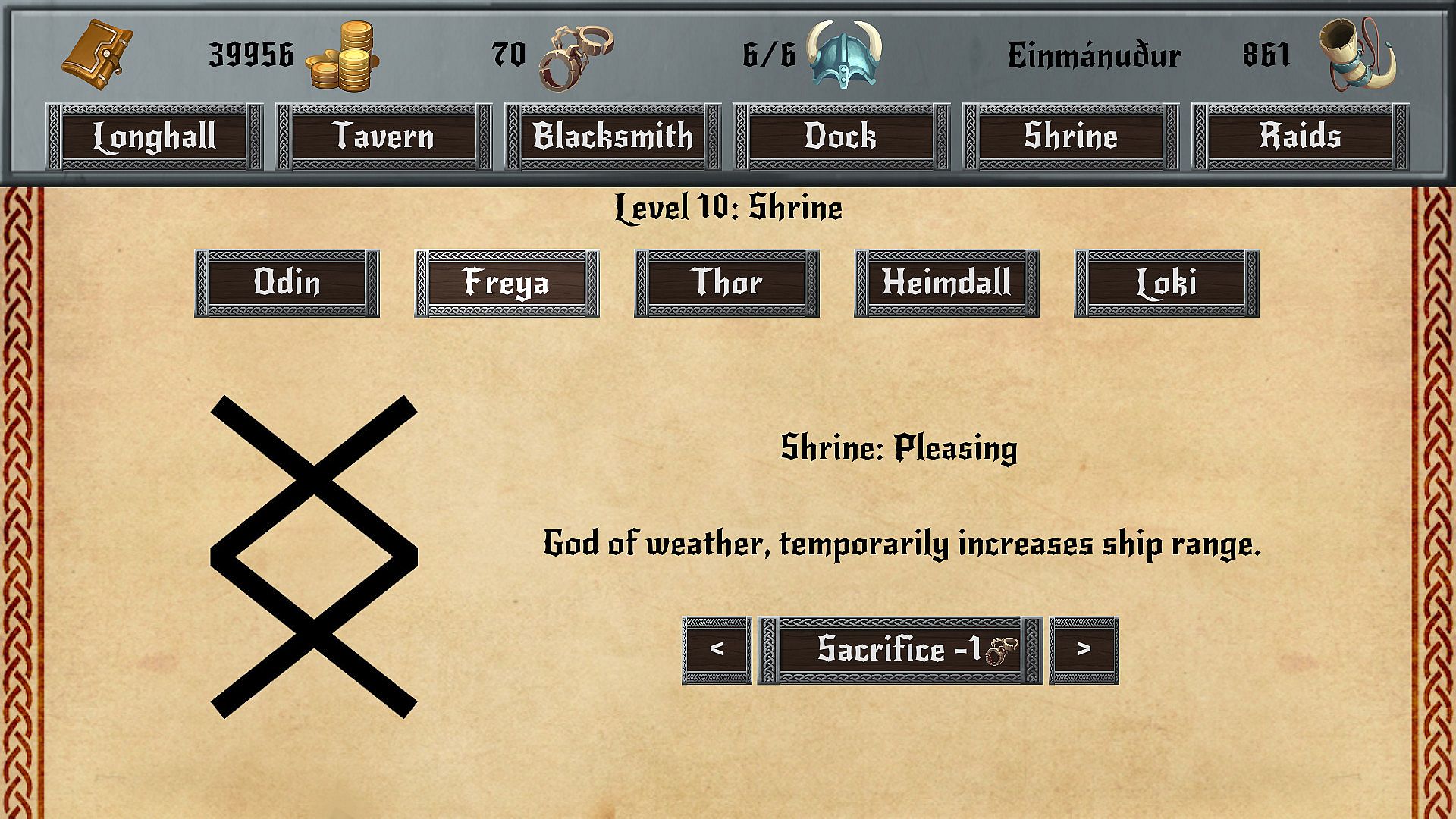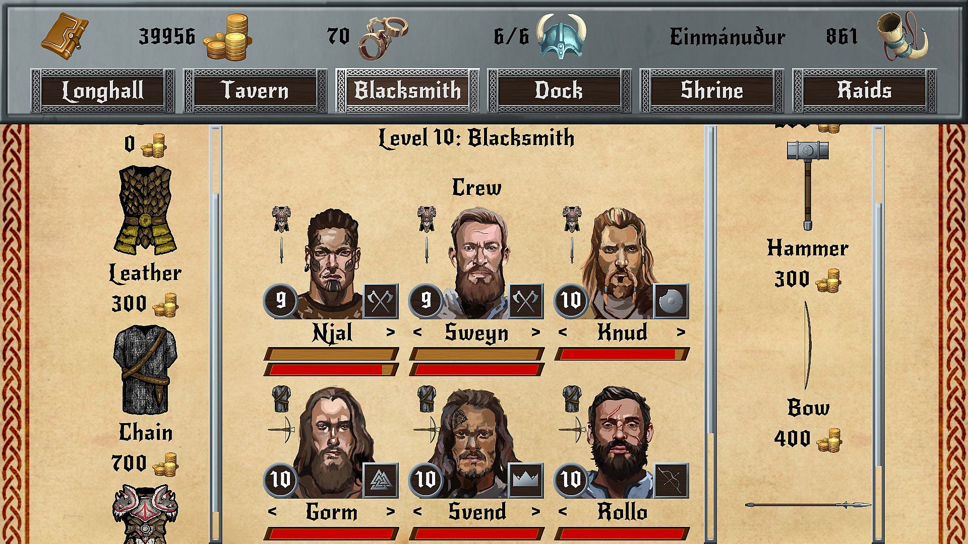 Build, manage and your own Viking fort. Choose where to invest your gold and slaves from your Longhall, Tavern, Blacksmith, Shrine and Dock. Upgrading each brings different bonuses, from a larger ship for more crew to new armour and weapons to worshipping more Gods.