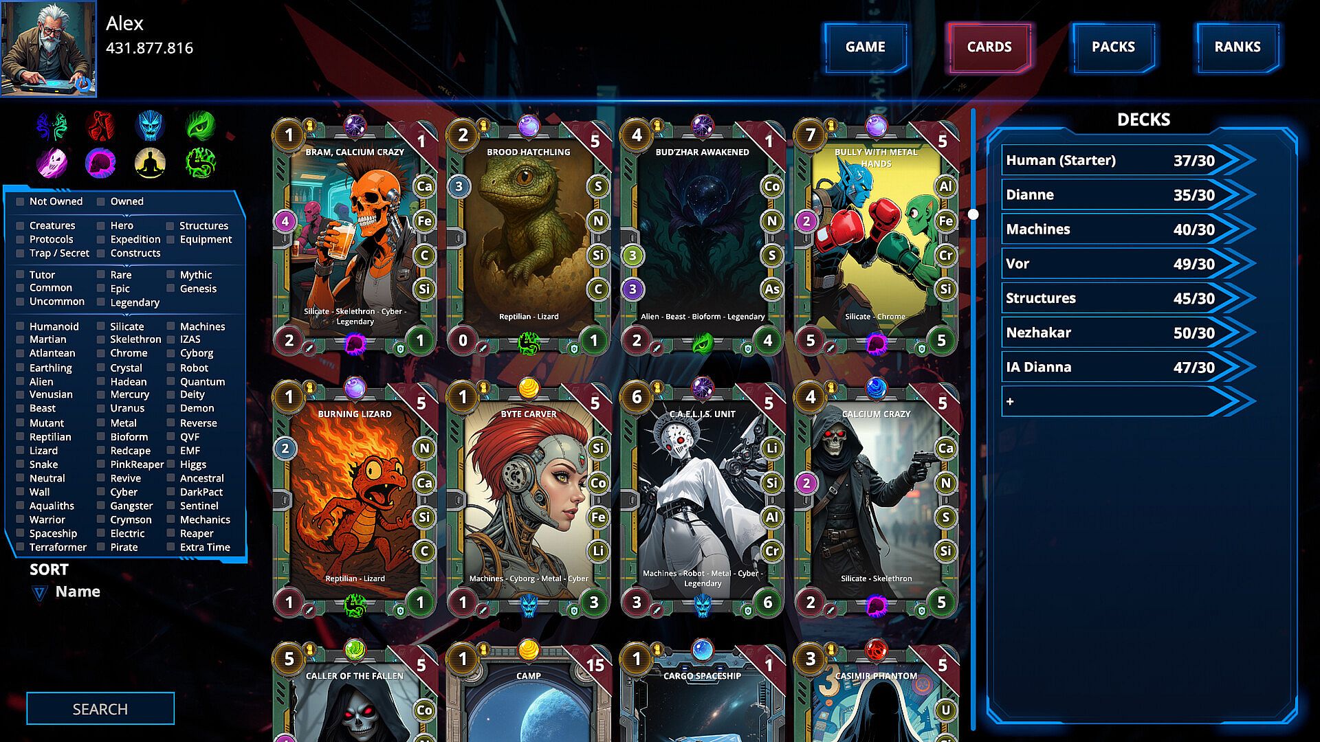 All cards are earned through gameplay — no purchases or random packs for real money.