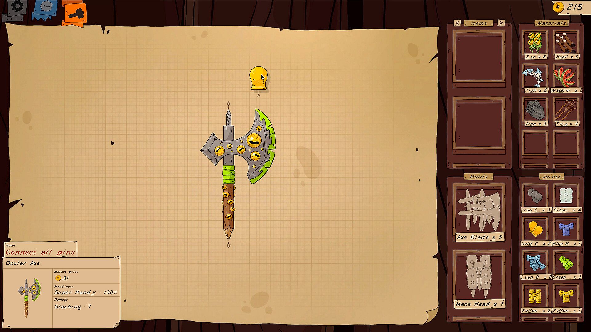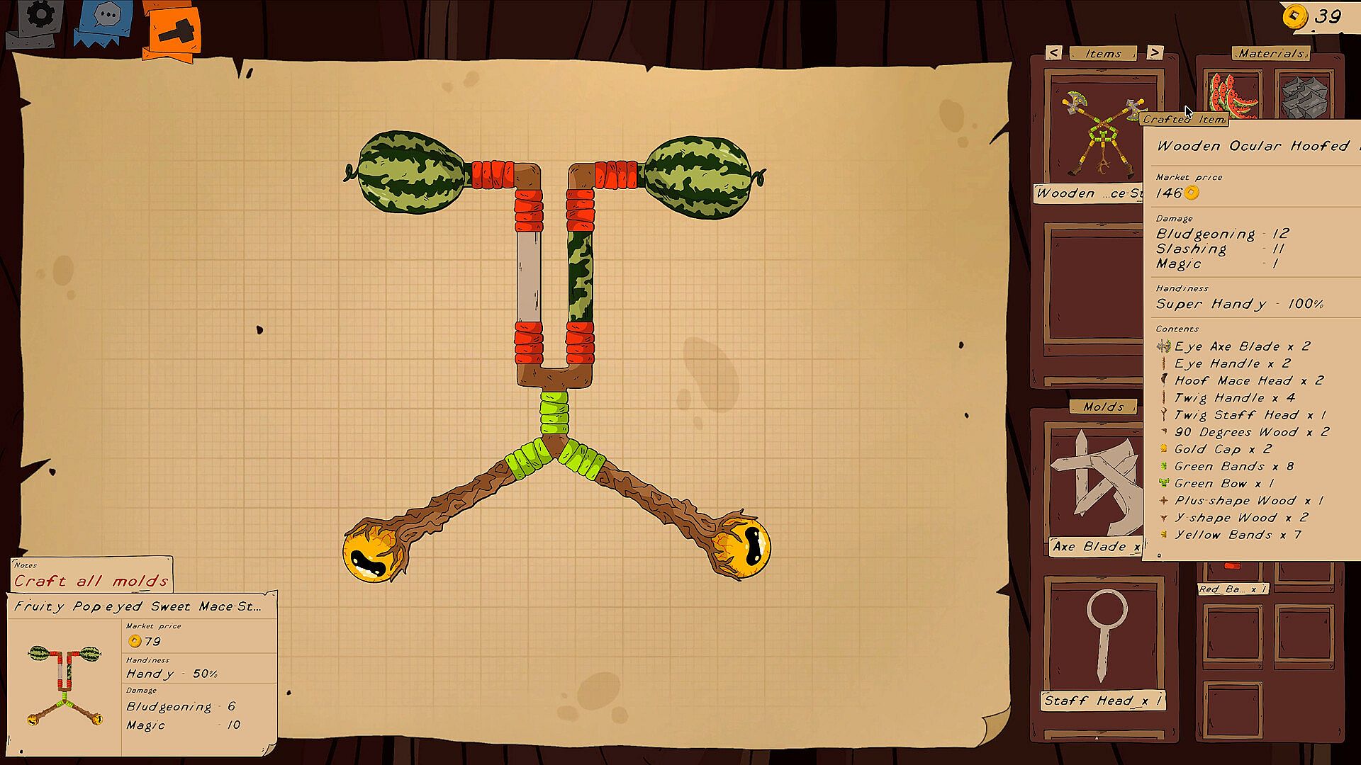 Assemble your loot piece by piece. Mix handles, blades and decorations to design something truly yours — from elegant weapons to total disasters that somehow work.