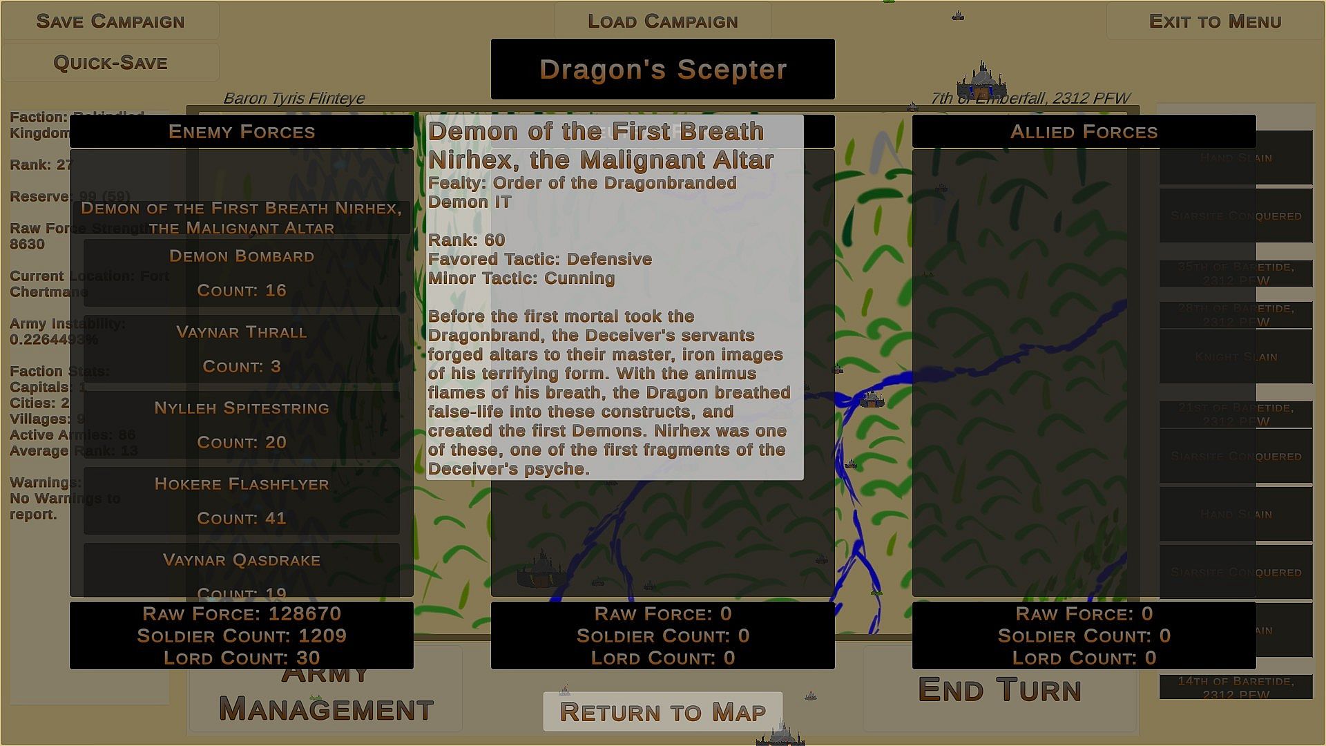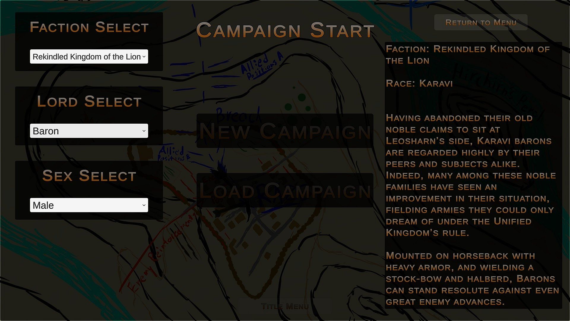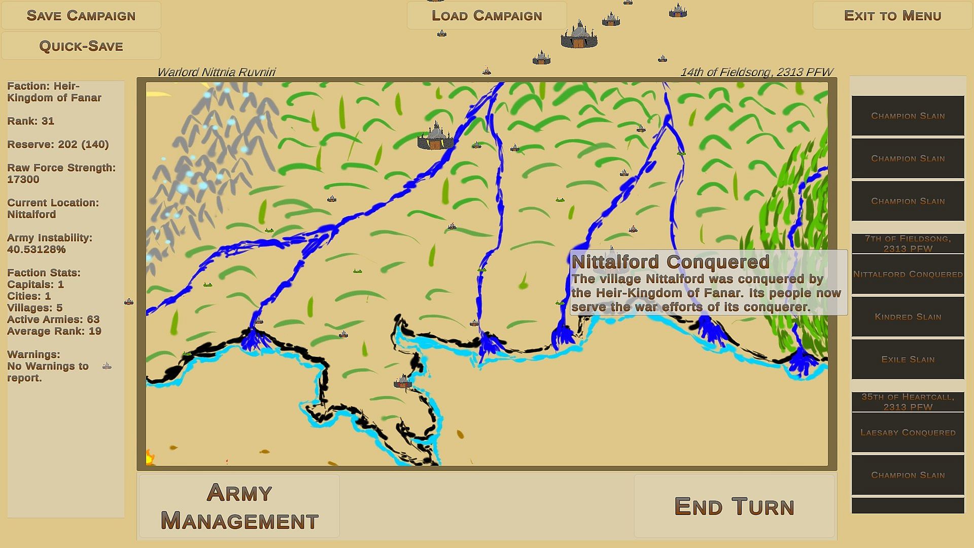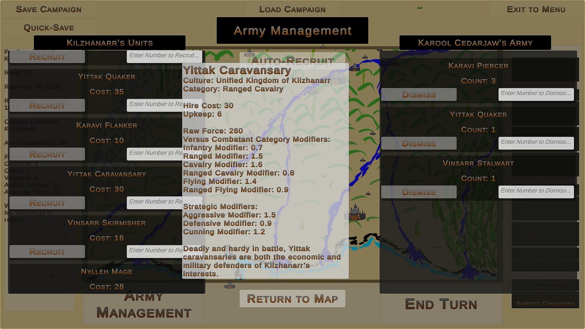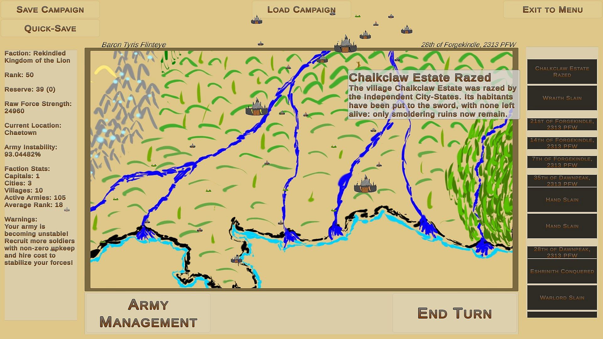 As a lord of one of the warring realms, you can recruit soldiers to your cause, who will spill their blood to advance your ambitions! For each victory you attain, your prestige grows, allowing you to demand more funds from your throne. But beware, for defeat will dull your position of power, and too many failures will see you dead amongst your soldiers!