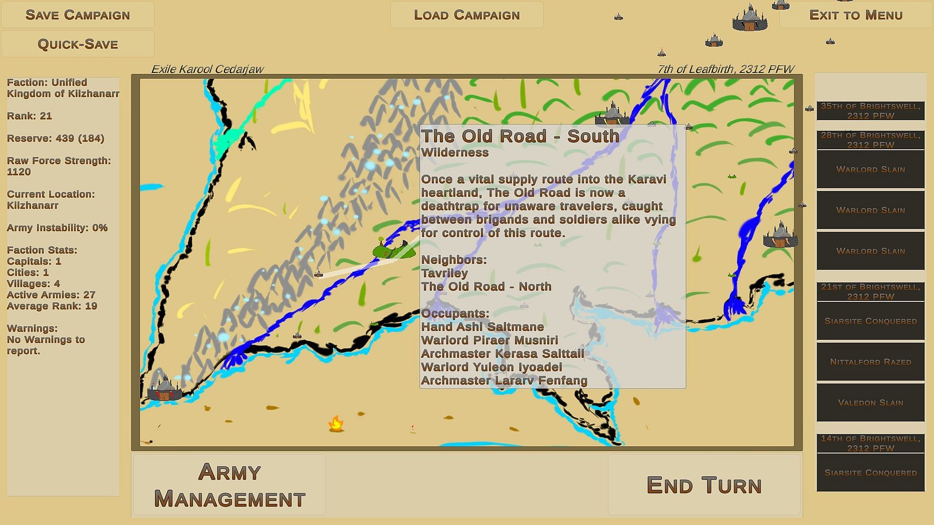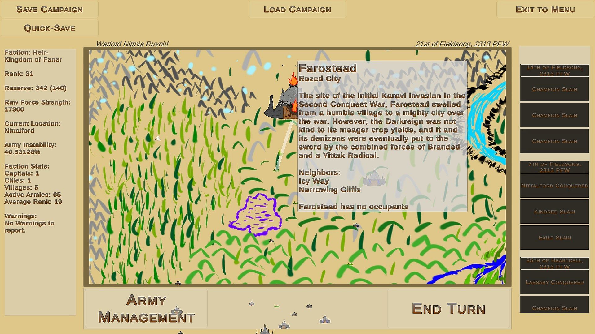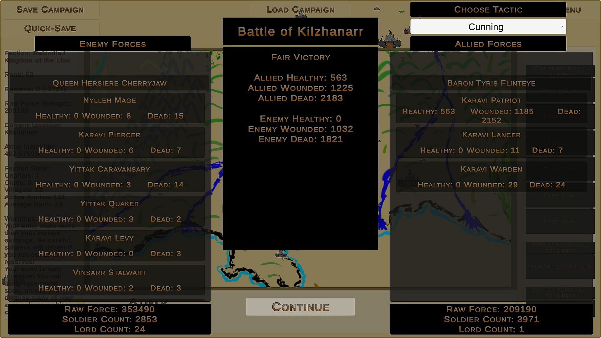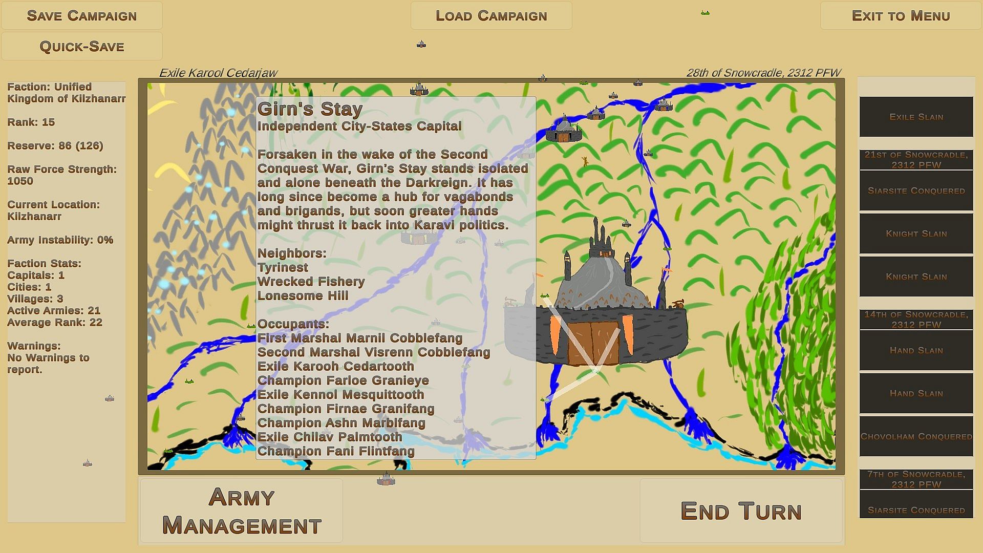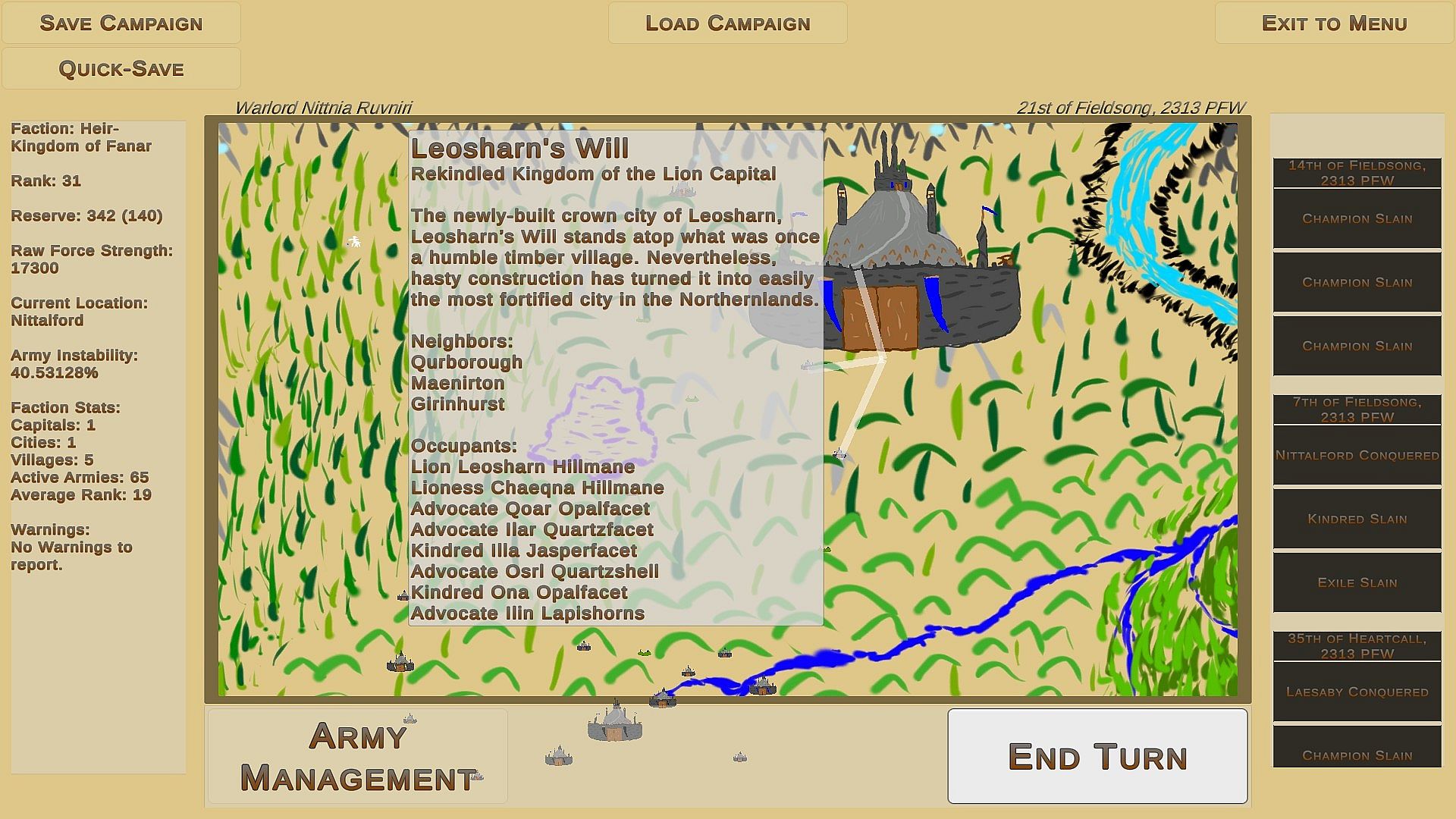 As a lord of one of the warring realms, you can recruit soldiers to your cause, who will spill their blood to advance your ambitions! For each victory you attain, your prestige grows, allowing you to demand more funds from your throne. But beware, for defeat will dull your position of power, and too many failures will see you dead amongst your soldiers!