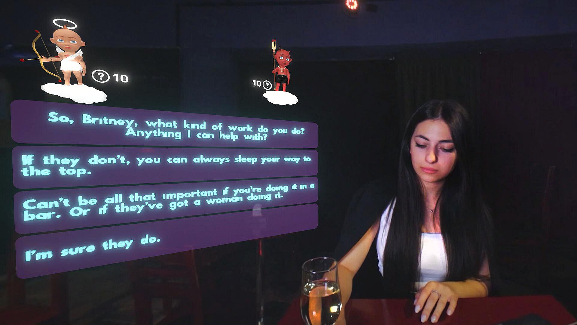 Meet four distinct women in Love Quest VR: Los Angeles-the romantic, business-savvy, rocker, and enigmatic gold digger-each brought to life by talented actresses for realistic interactions. Players take the lead in a VR romance simulation set in Los Angeles, steering conversations on first and second dates to shape relationships and pick a partner. Animated 3D guides, Cupid's angel and the Devil, offer tips on dating dynamics. This indie casual adventure sharpens conversational skills through choice-driven paths and emotional storytelling. Tailored for adult male gamers, it delivers an authentic VR quest to explore romance and female perspectives in a vibrant city backdrop.