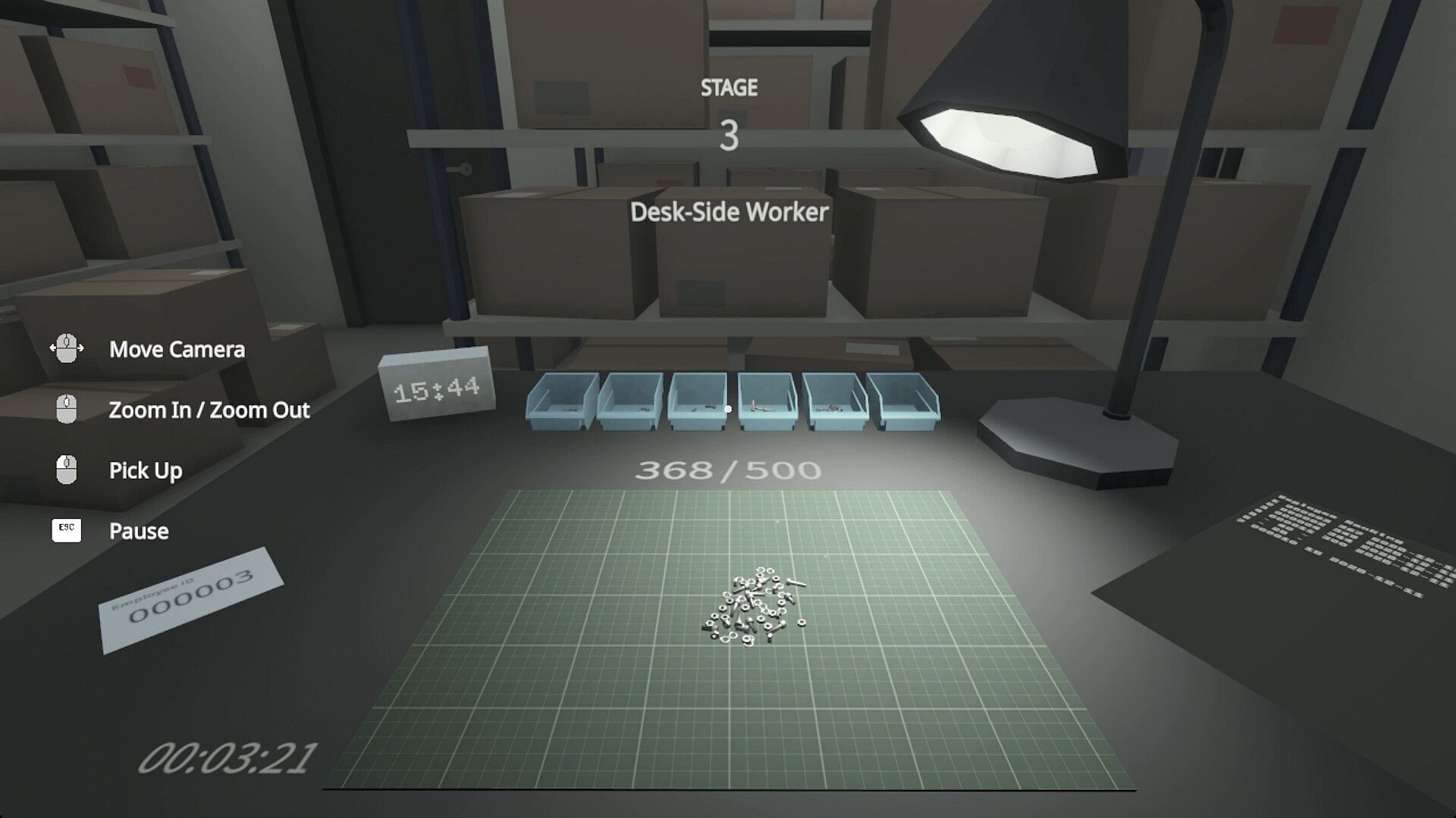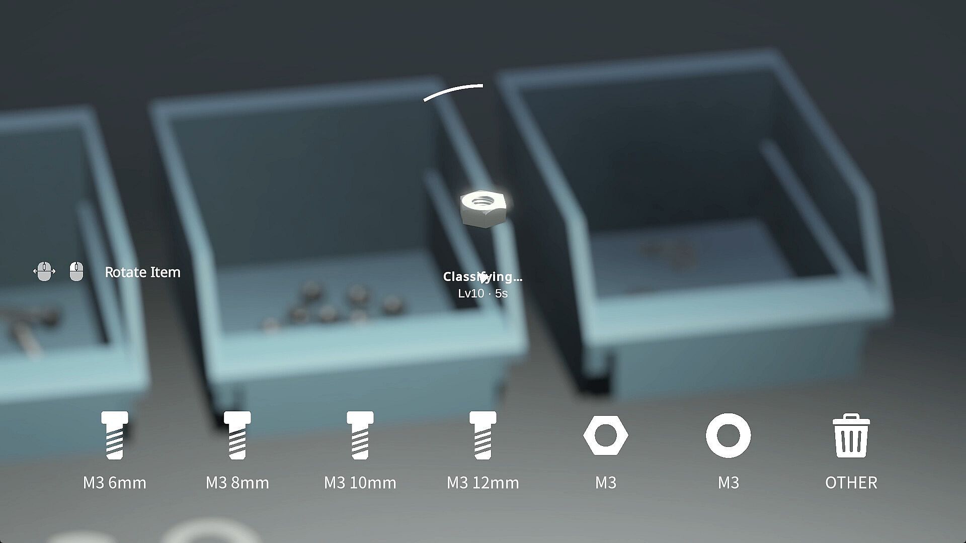 A single, mind-numbingly simple task awaits you: sorting scattered parts on a desk by type.