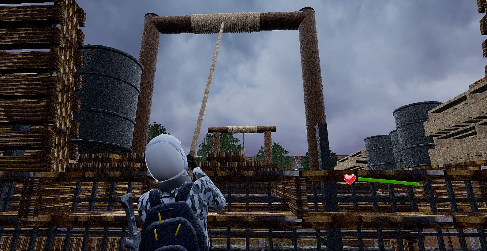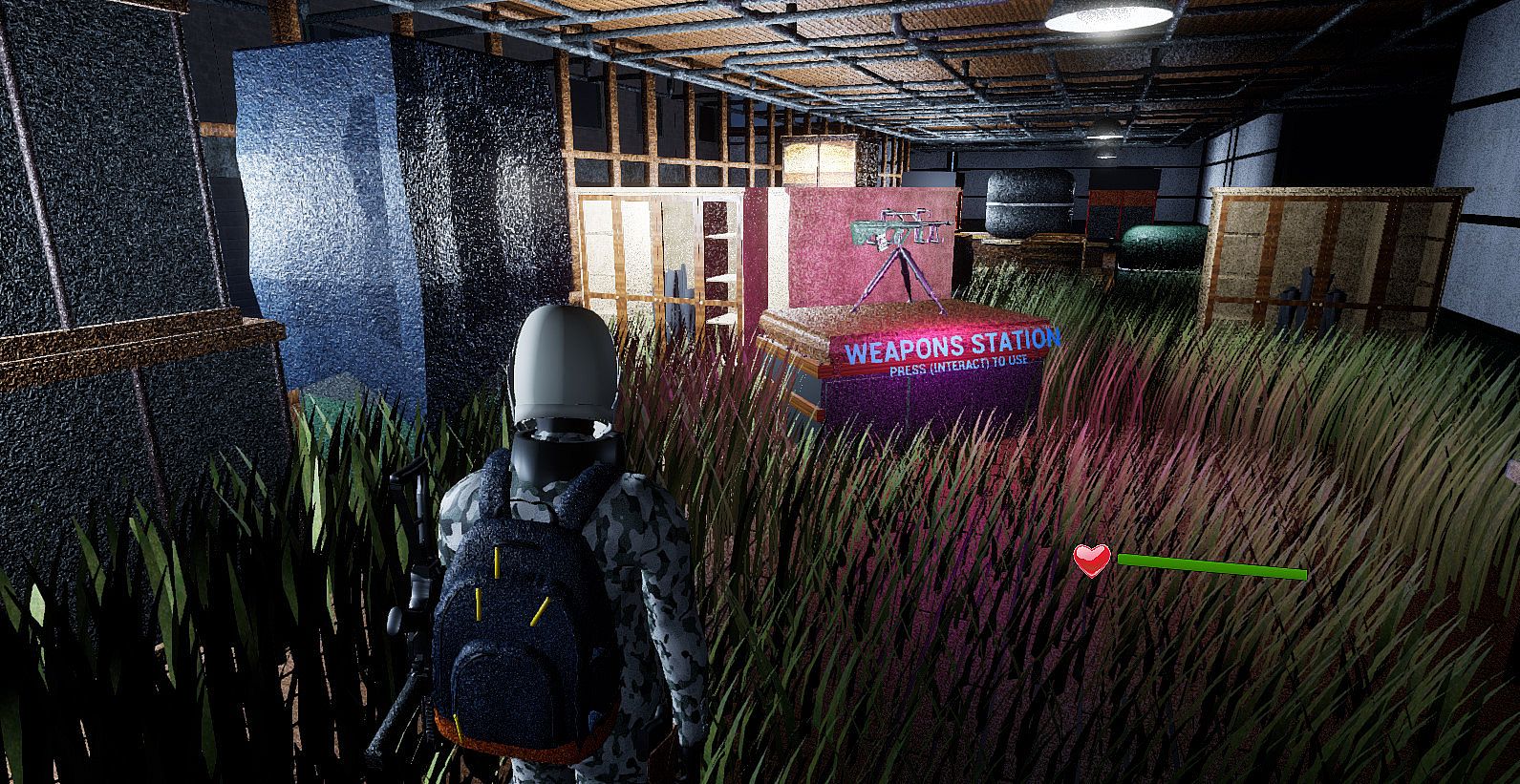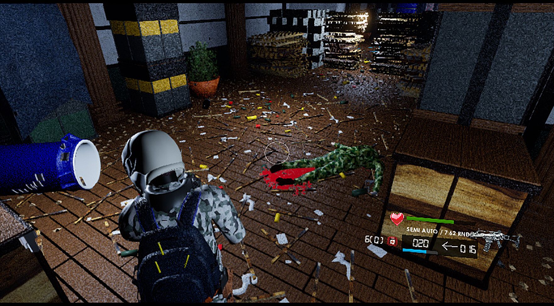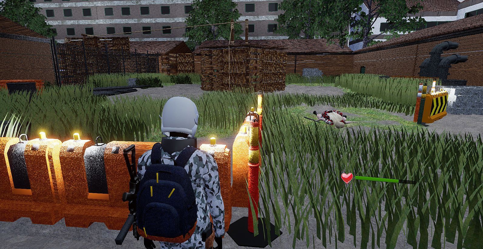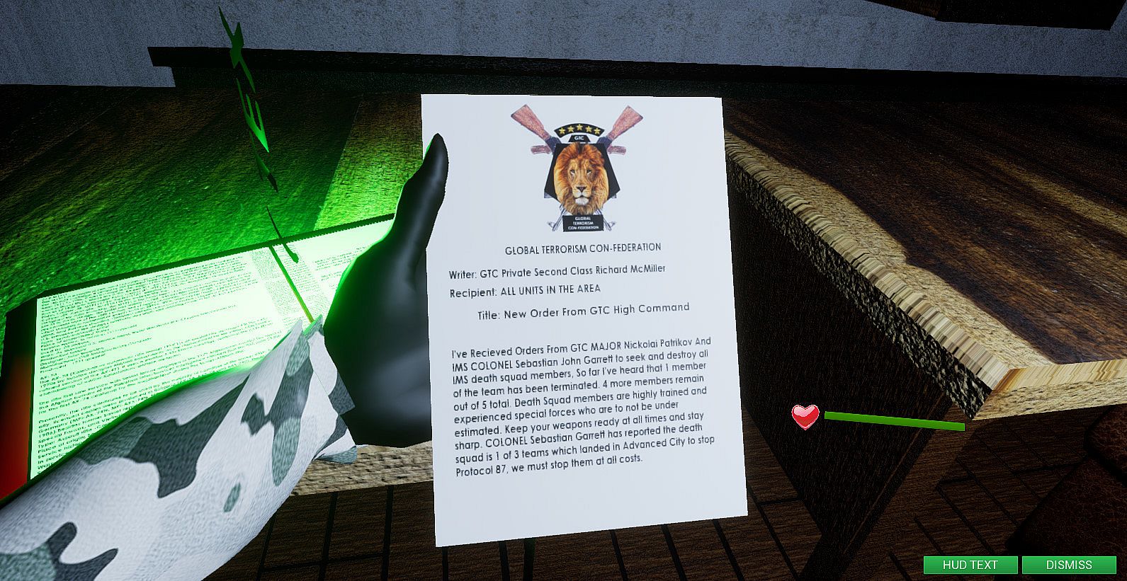 IMS Death Squad is a shoot'em up action game, where the player has 2 rifles, a pistol and grenades, has to fight off enemies, solve puzzles and loot the world to survive. You start off with the G36C, UMP and USP45 as your primary weapons. The Player has to take cover, sprint away or temporary hide from enemies to regenerate health during gunfights. The environment is overgrown and is explorable with pickups to find, there are text logs explaining background story, medikits, ammo, pipebombs, molotovs, money and more to be found. Exploration is part of the gameplay loop and you have to explore to find resources to help you survive.