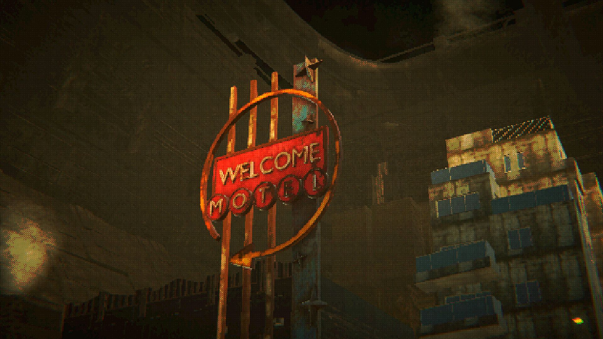 Retro 90s-style PC visuals blended with modern lighting and post-processing, giving the city a grainy, dreamlike, almost unreal quality.