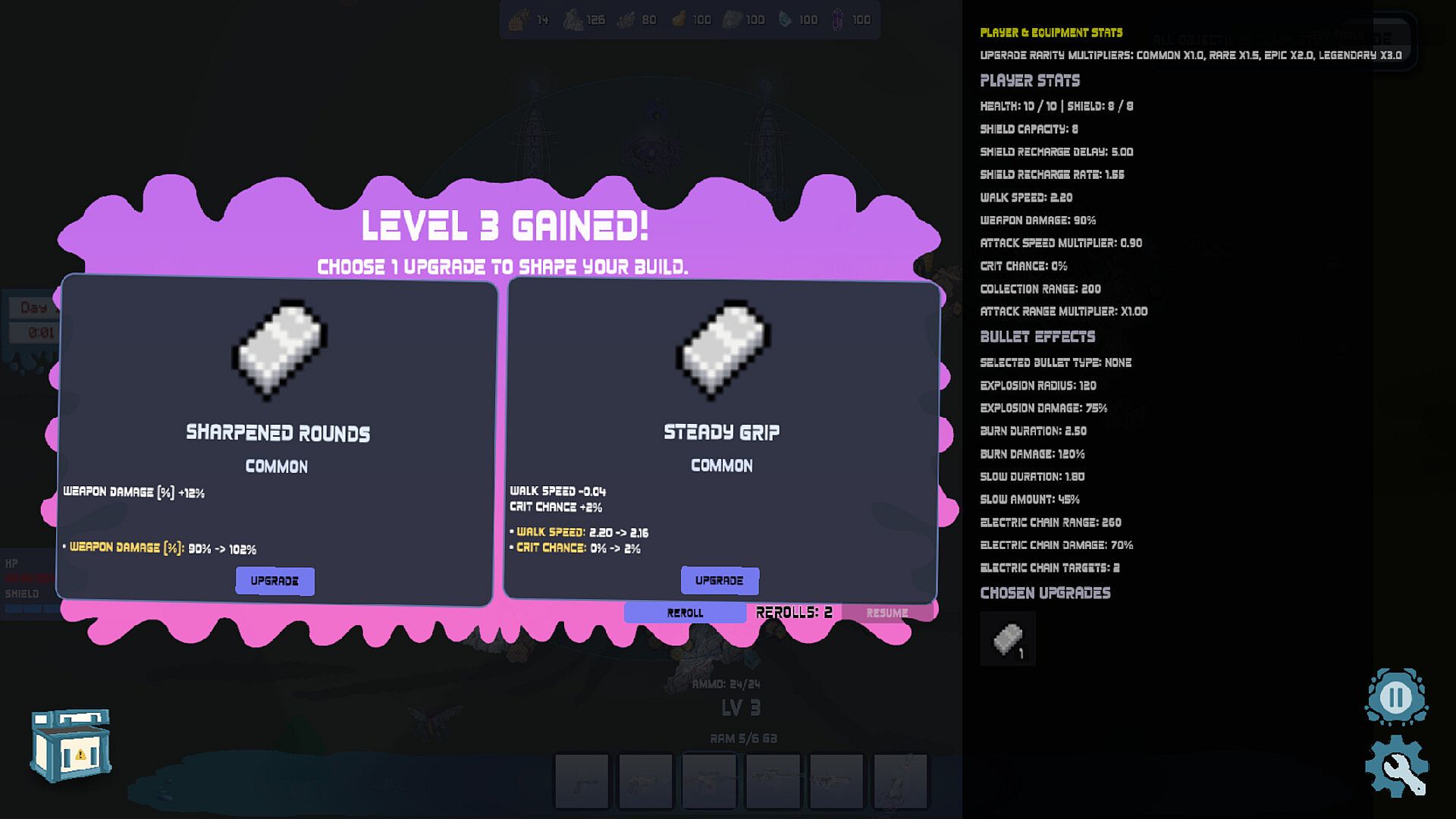 Upgrade health, crit chance, movement, crafting efficiency, and elemental abilities through meaningful choices and trade-offs that persist across runs.