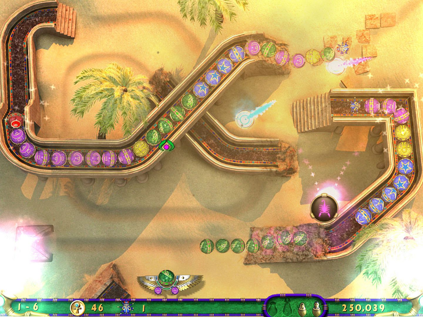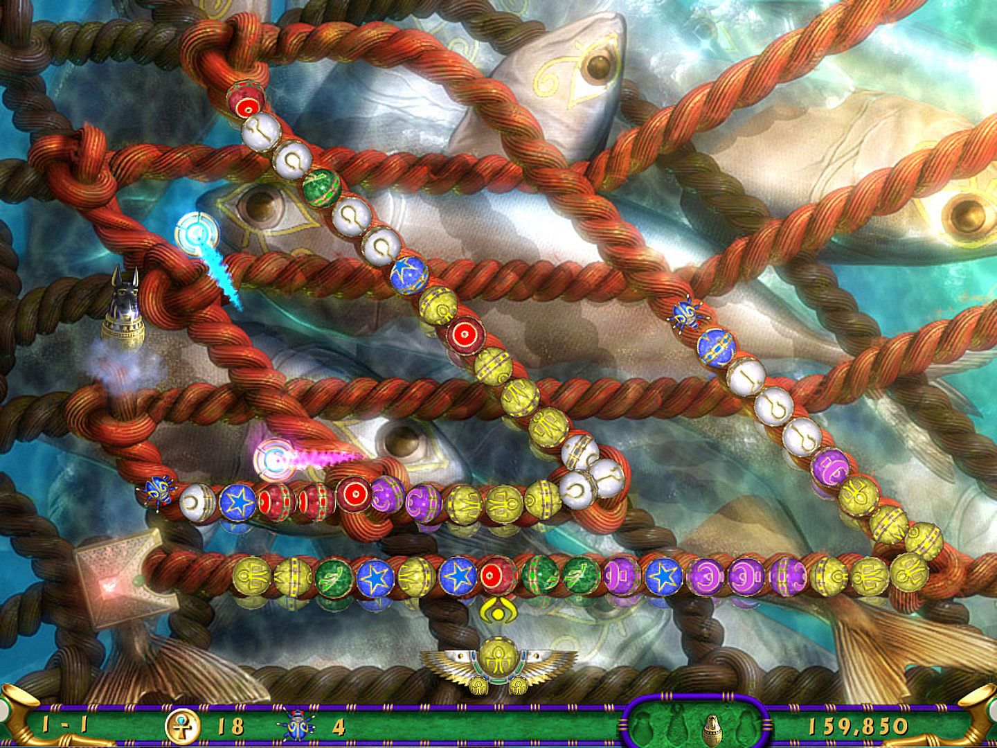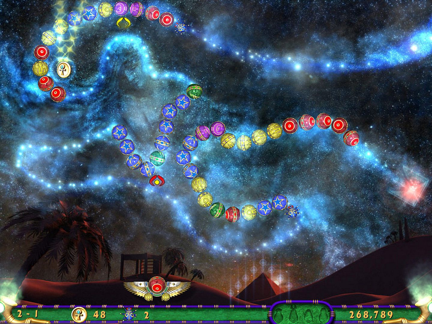 Stop the procession of approaching spheres as they journey through the maze by matching three or more. Call upon the gods, denoted by color, to release specific power-ups and purchase upgrades with Ankh coins collected during gameplay. Free all the gods from captivity before they reach the pyramid at the end of their path, or all is forever lost.