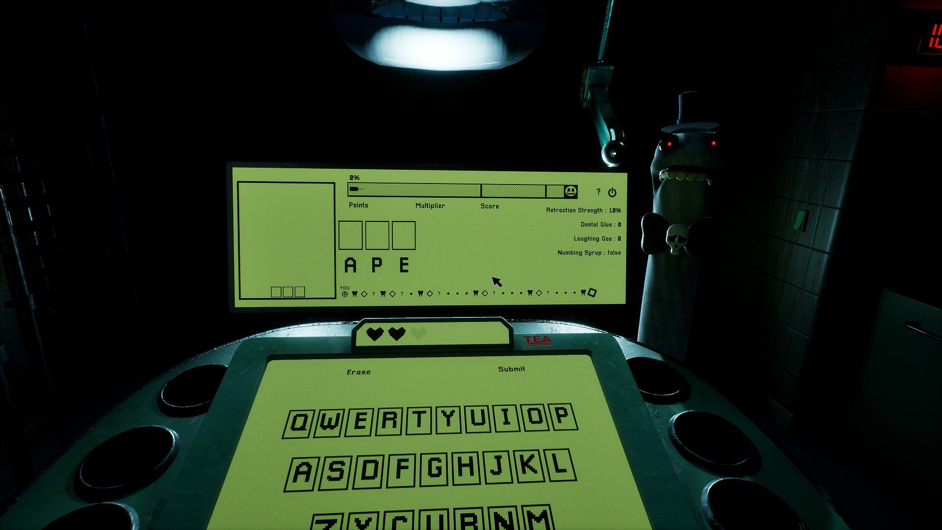 Survive horrific pressure as you try to guess words before being brutally drilled by an esoteric being. Utilizing only your wit and a handful of consumables, can you make it to the end alive?