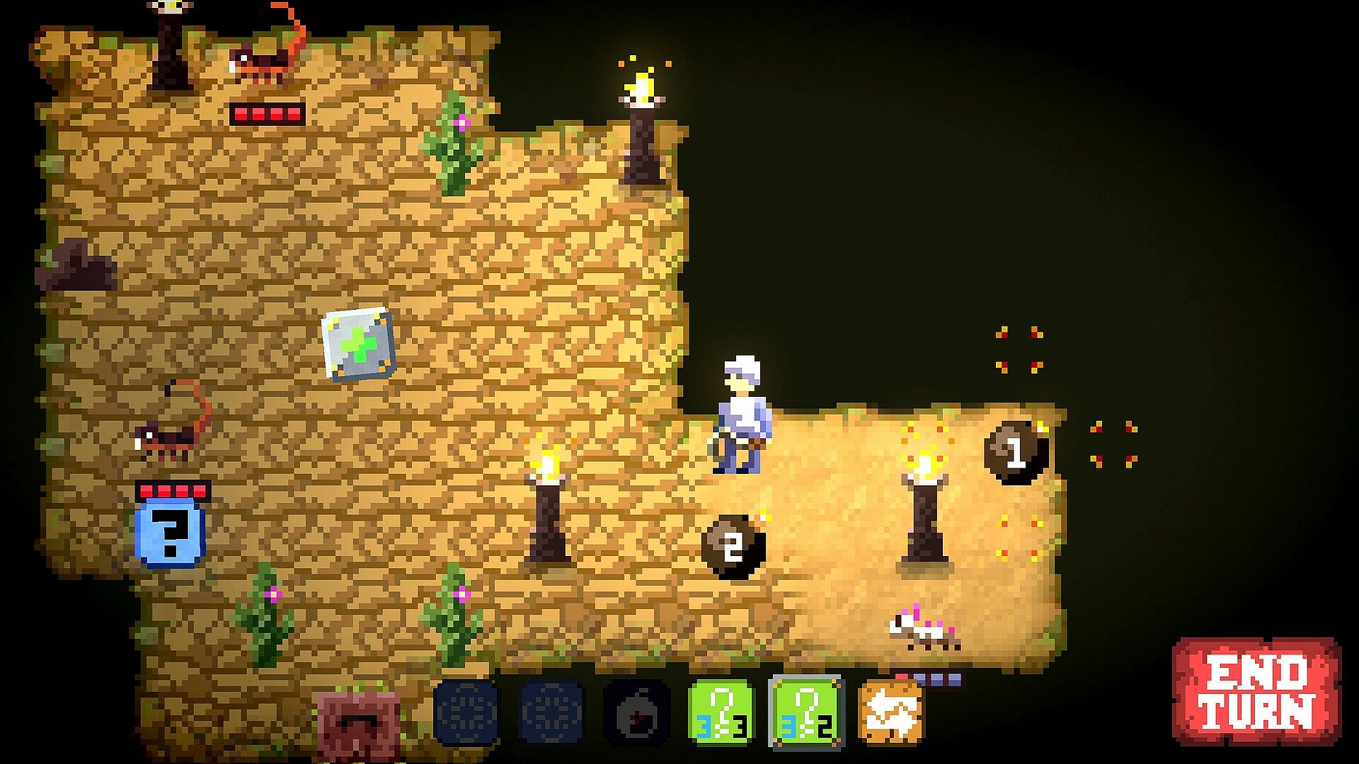 The dice have been re-rolled; it is a new turn. Plan ahead and see what is optimal in the situation or play fast and hope for the best. Keep enemies at a safe distance or kill them off before they get to you. When the turn is over, it will be too late to run.