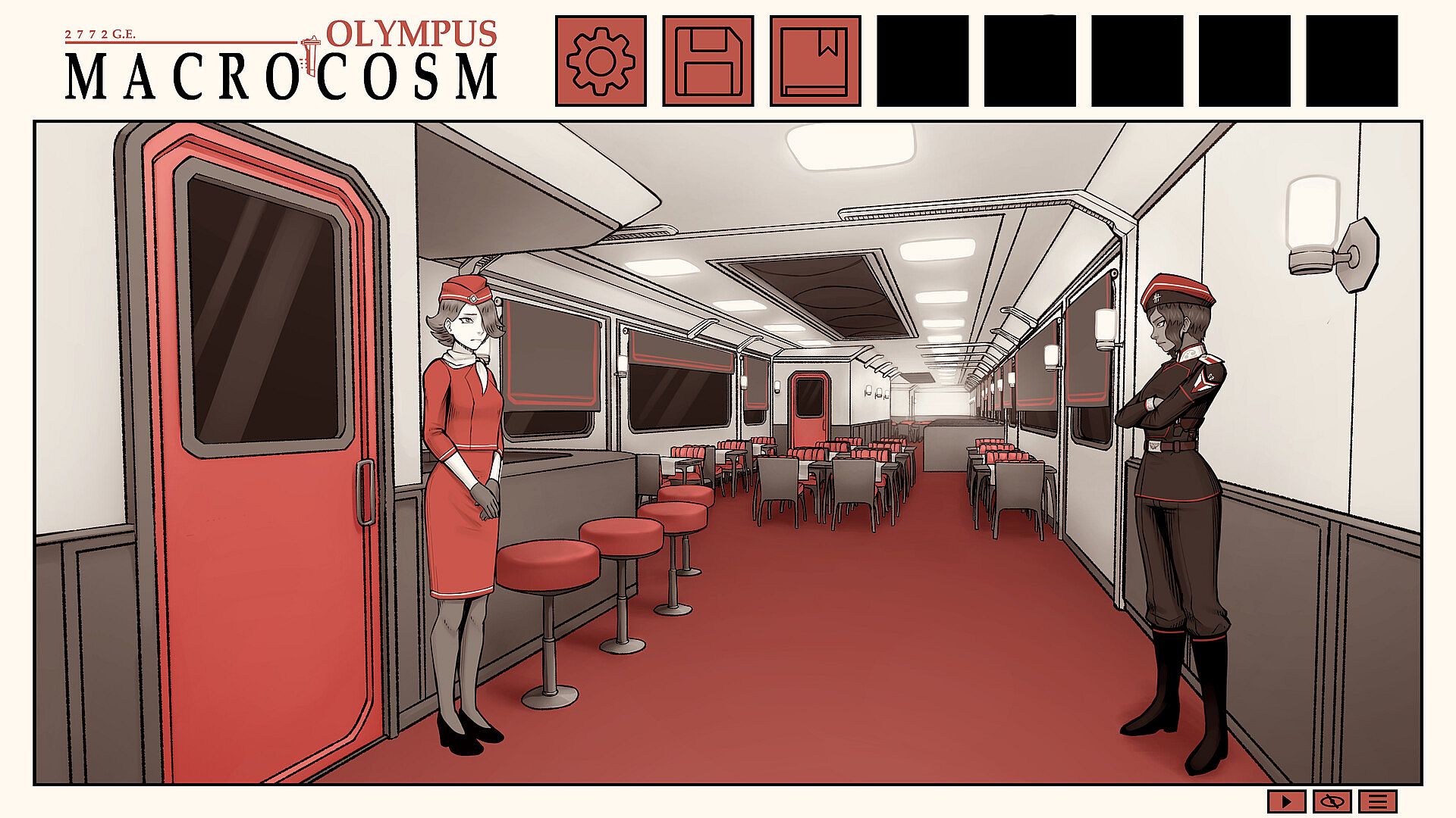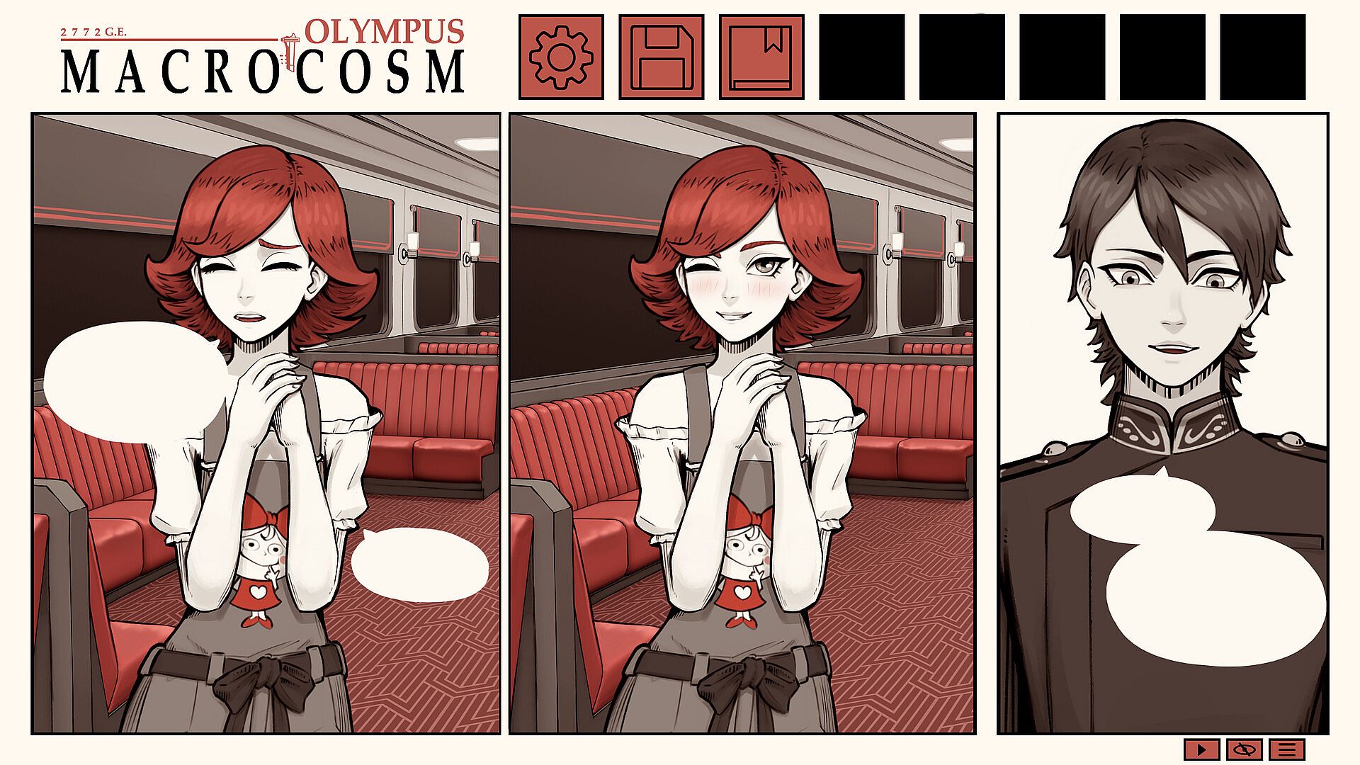 "Macrocosm 2772 G.E.: Olympus" is a role-playing visual novel featuring a character statistics system that depends on the choices made by players.