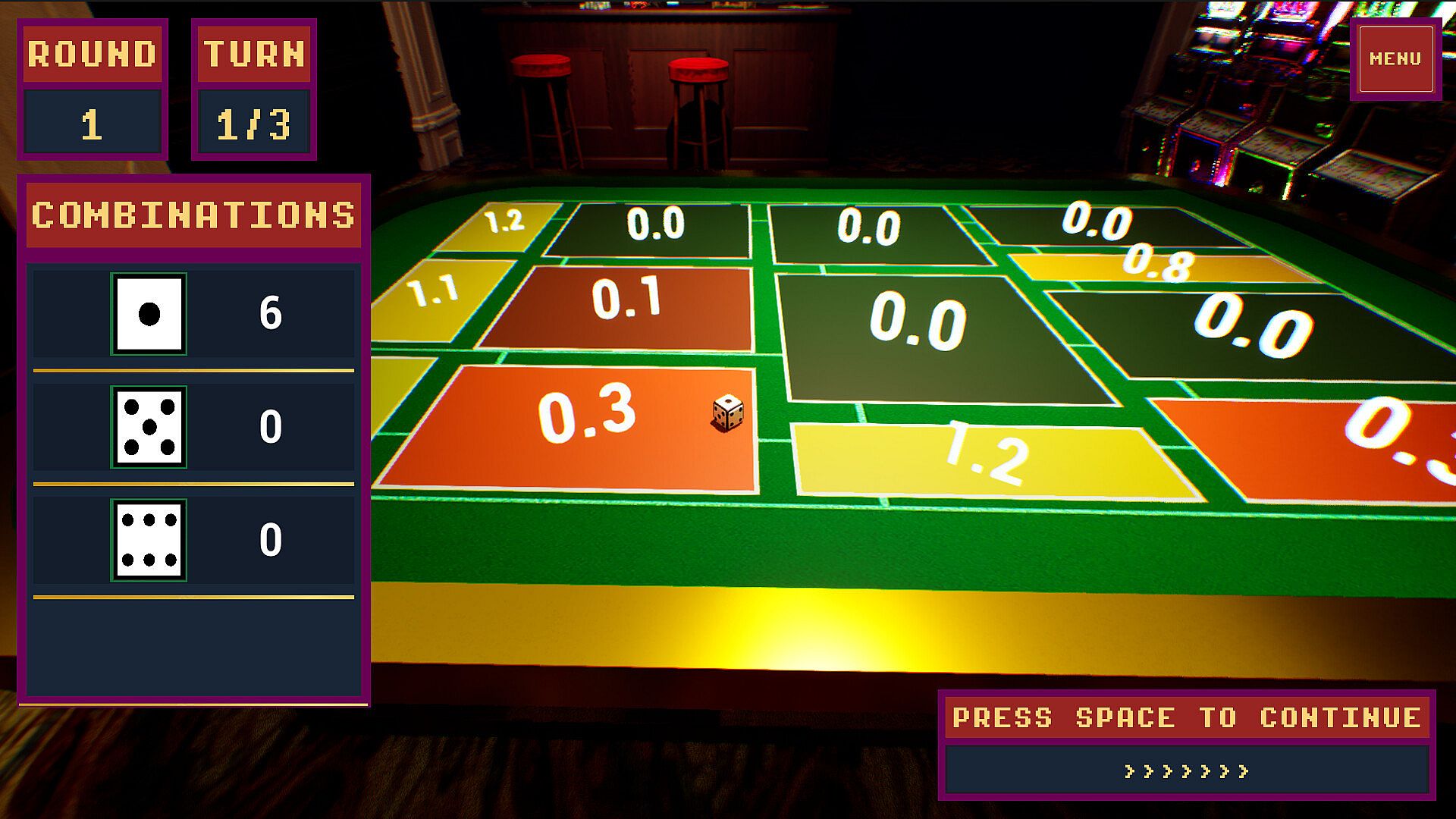 MadDice is a high-stakes, push-your-luck roguelite set inside a smoky old-school casino where every roll can launch a score-exploding combo or instantly collapse your run. With only three turns per round, you’ll need to decide how far to push your luck, how boldly to build your dice pool, and when to cash in your bonuses before everything crashes down.