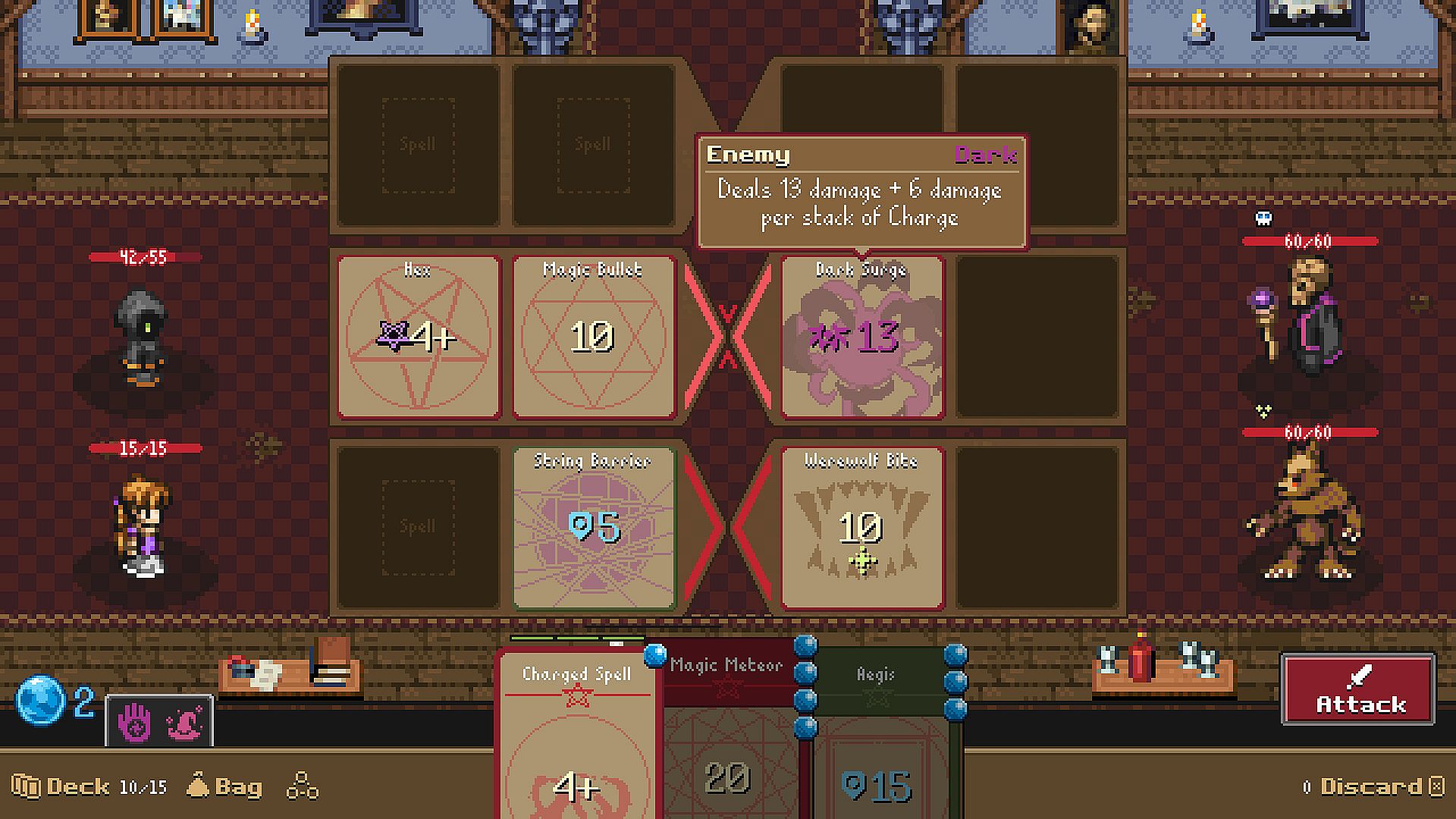 Magecraft: Spellbuilding is a deckbuilder with a focus on crafting your own spell cards and creating unique decks to take with you into the turn-based combat of the Dungeons.