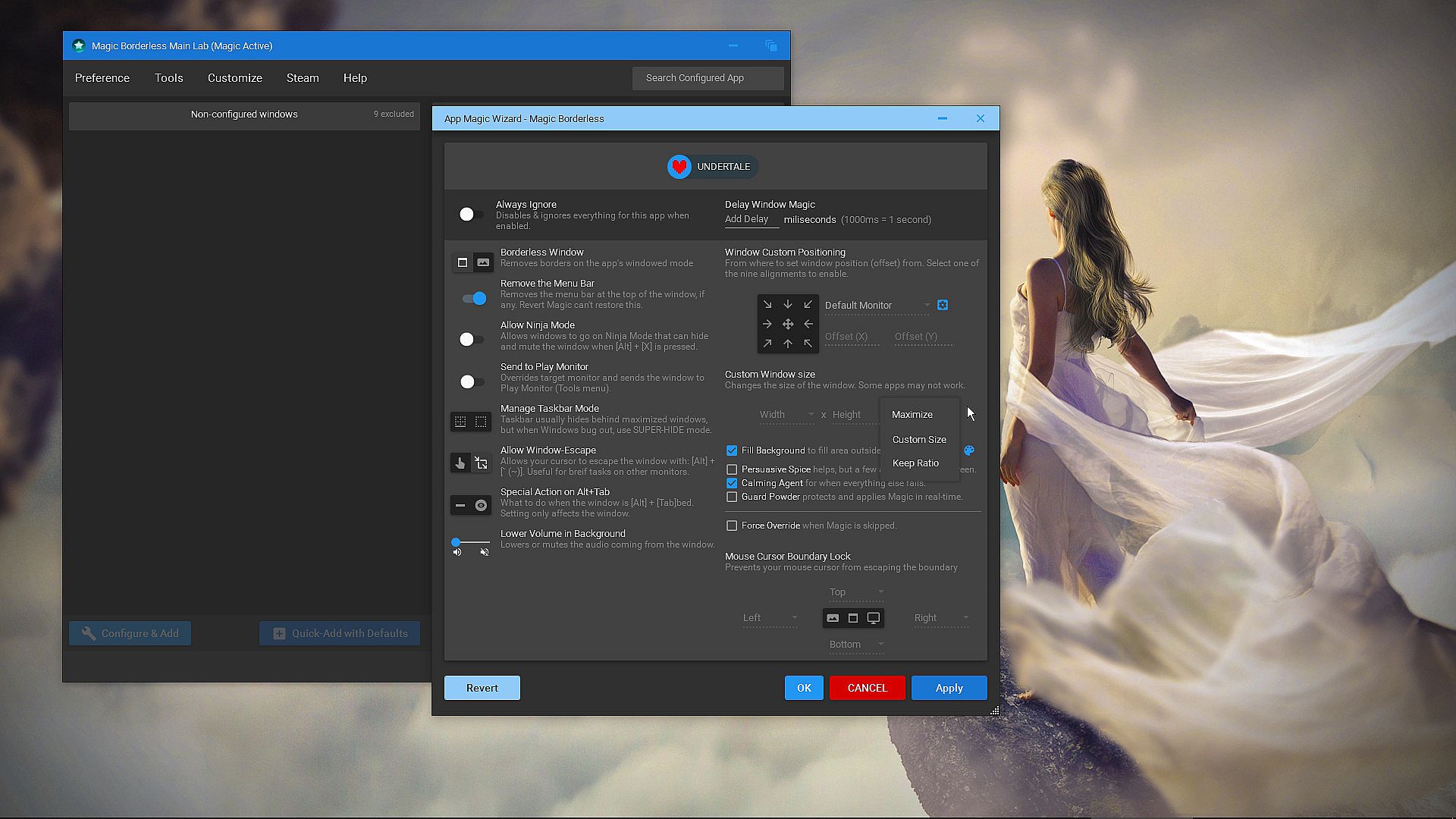 Besides making your favorite games borderless, you can also set the game to run on a specific window size or simply maximize to your monitor's resolution. If you wish to keep your Taskbar up, you can also toggle it to make sure the window does not hide the Taskbar.Some also prefer their borderless windowed mode to behave like real fullscreen apps (minimize the window on alt-tab). For those weirdos, you can set the Alt+Tab behavior to minimize the window.