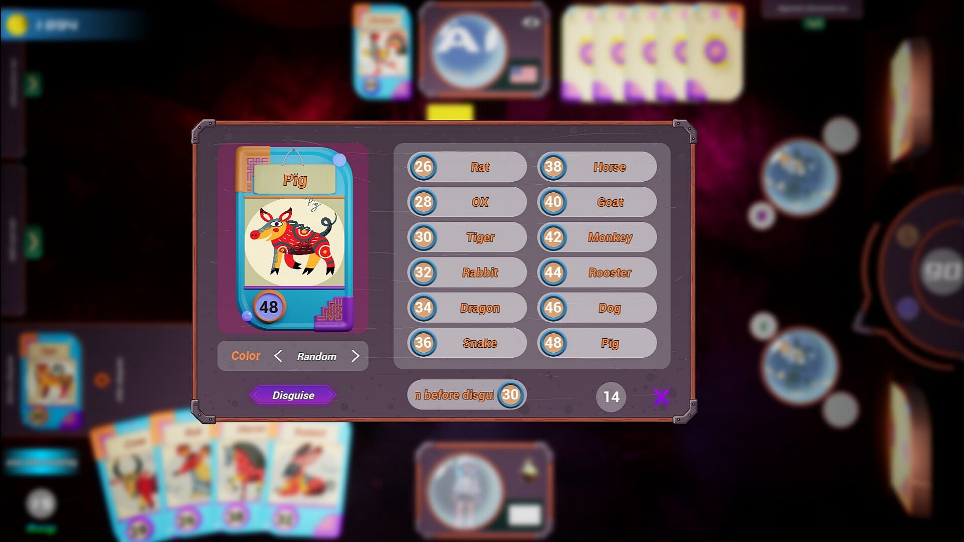 • Regarding animal cards: The card library currently has 12 types of animal cards, each of which is divided into orange, yellow, and blue, totaling 36 animal cards. Each animal card corresponds to a desired value (represented by a number in the bottom left corner of the card)