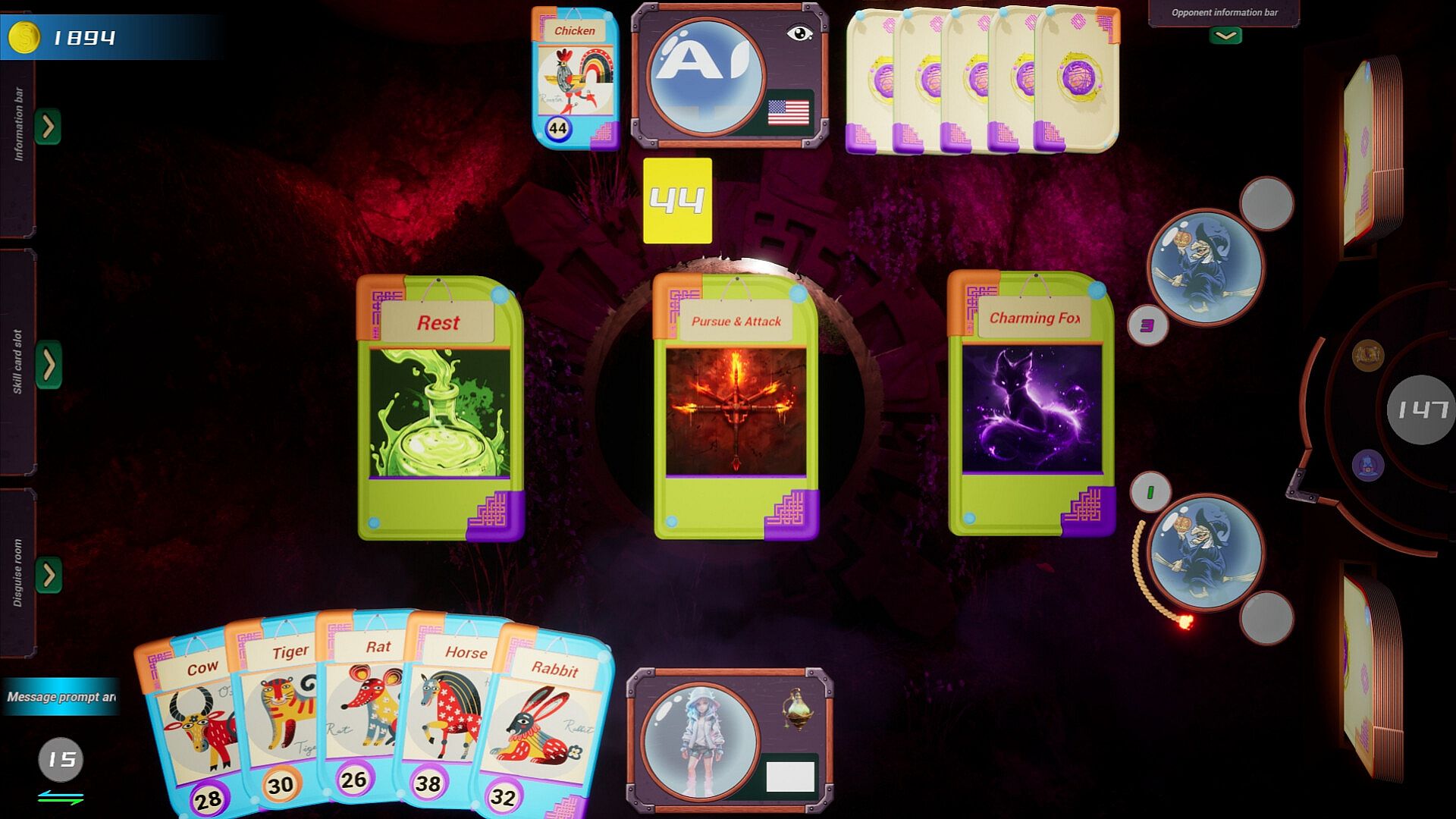After playing the animal card, the reputation value of the animal card will be displayed above the personal image, and when the background is yellow, it is the value for disguise. The true reputation value displayed on a white background. Entering the fruit card round will display the sum of two rounds of reputation values, which is the total reputation value. Then both sides issue skill cards, followed by fruit cards. If the fruit cards of both sides are the same (only distinguishing names without distinguishing colors), the total reputation value of both sides will be exchanged.