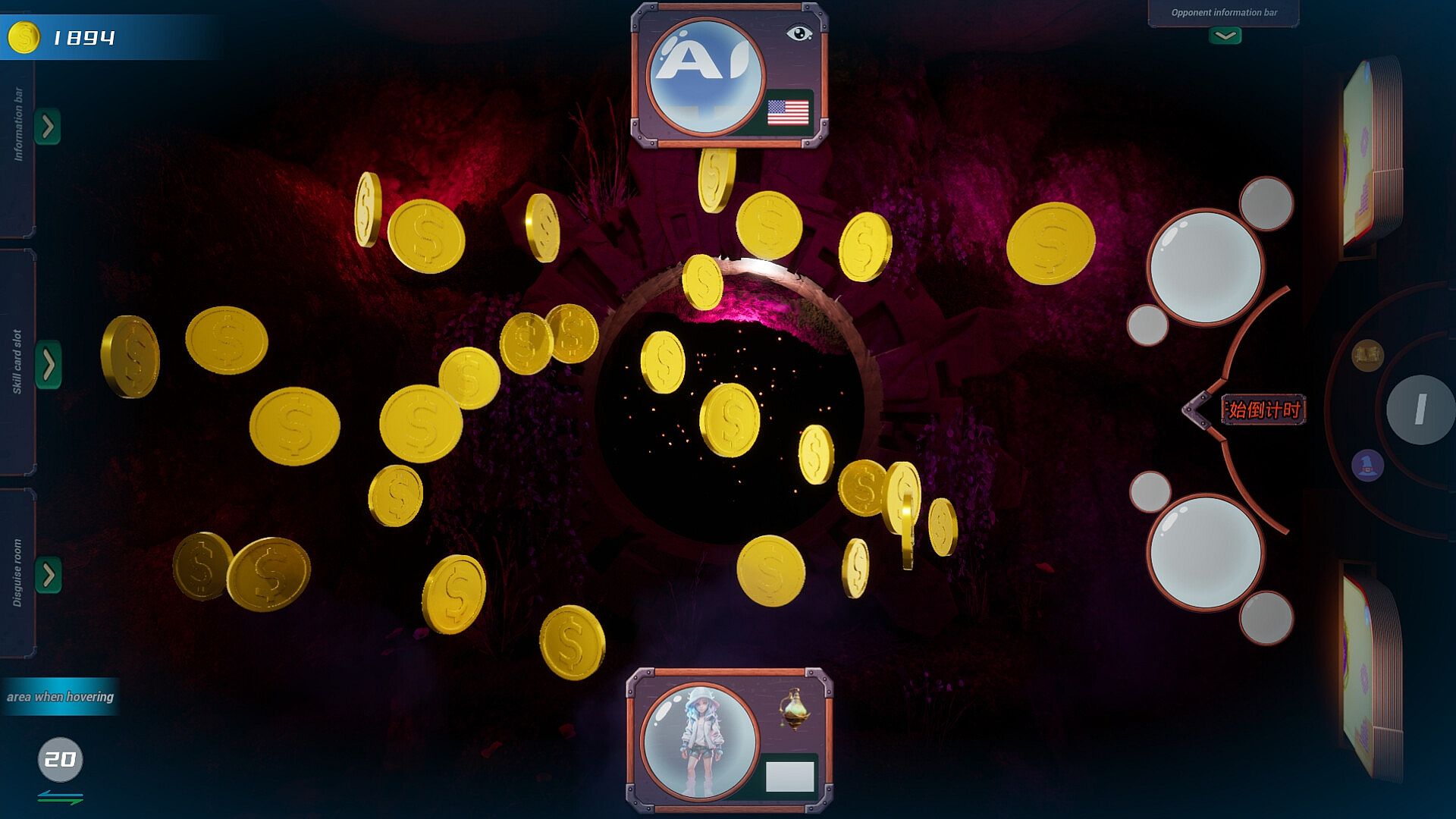 The side that wins the most coins at the beginning starts first. Two rounds of animal cards will flow out from both sides, each lasting 180 seconds. During this time, players can choose between wizard and strategy skill cards. The sum of the reputation values of the two rounds of animal cards will be the final reputation value. Then the fruit cards will flow out again, and within the time of operating the fruit cards, players can use summoning, immortal tools, and peeping mirror skill cards. Each time is 180 seconds.