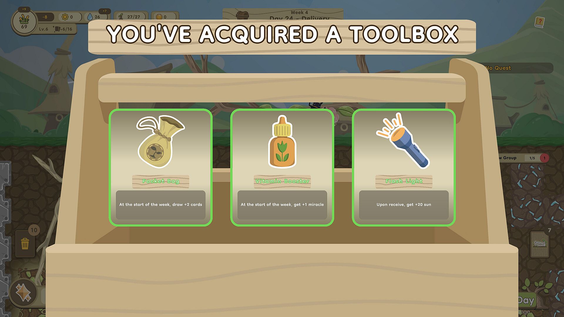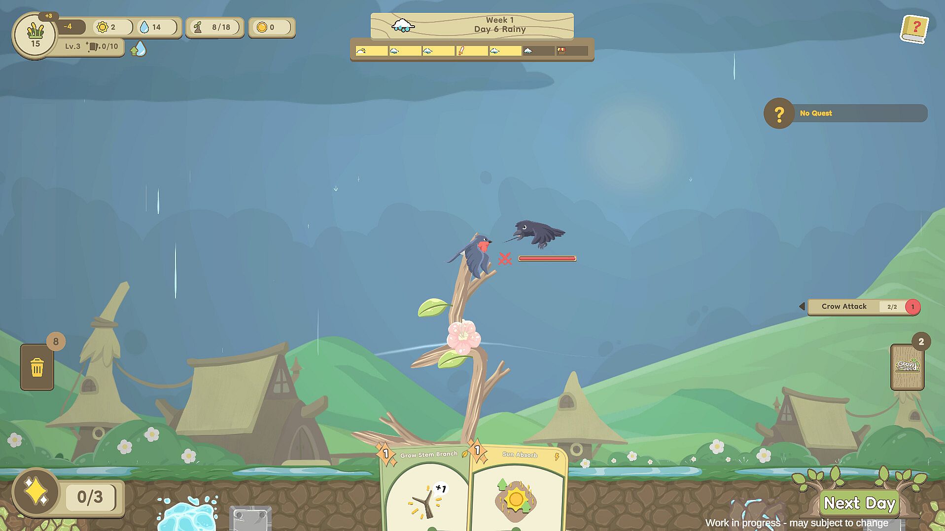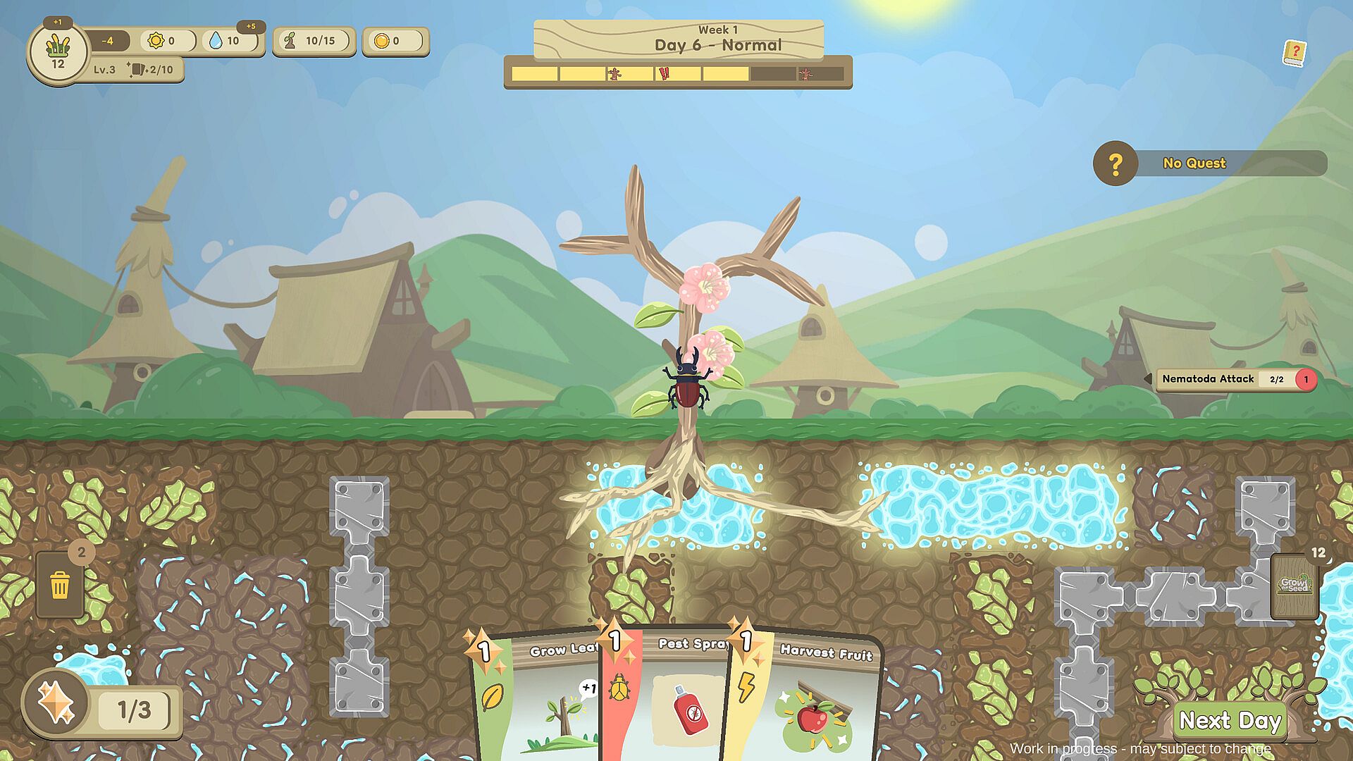 In combat deck-building games, you use cards to inflict damage, shield yourself, or perform other actions. In Magica Planta Botanica, cards are used to grow your tree. You can plant a root or stem toward a specific direction, grow leaves for photosynthesis, or a flower with the hope that it will bloom into a fruit. Well, even if it fails and begins to wither instead, don't fret – cut it loose! There are no more soils or water that can provide any nutrients or water for photosynthesis? Say no more, add more soils! With cards, of course. And if you have enough Miracle to use too, of course.