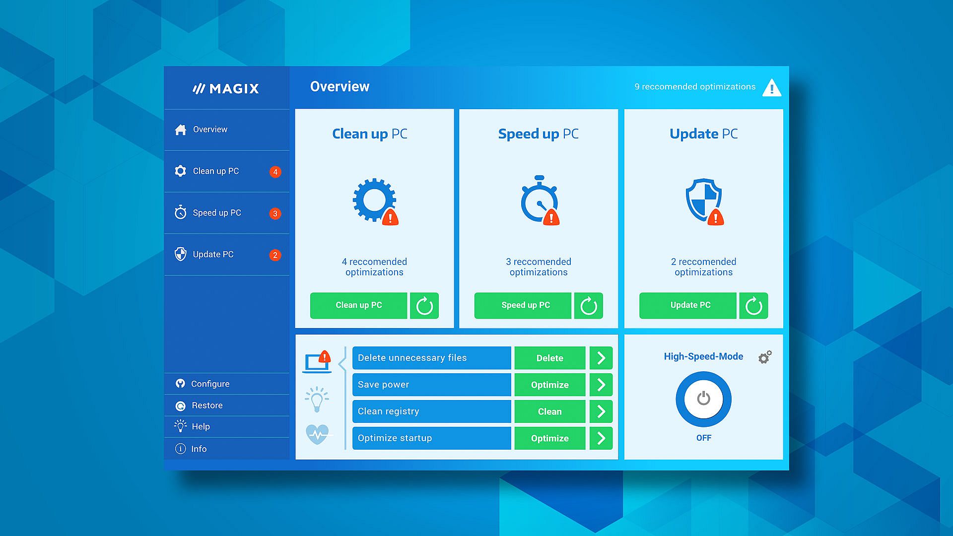 Access functions directly from the Windows startup menu without the need for a separate program startup. The most important optimizations are displayed directly after program start in the main program interface.