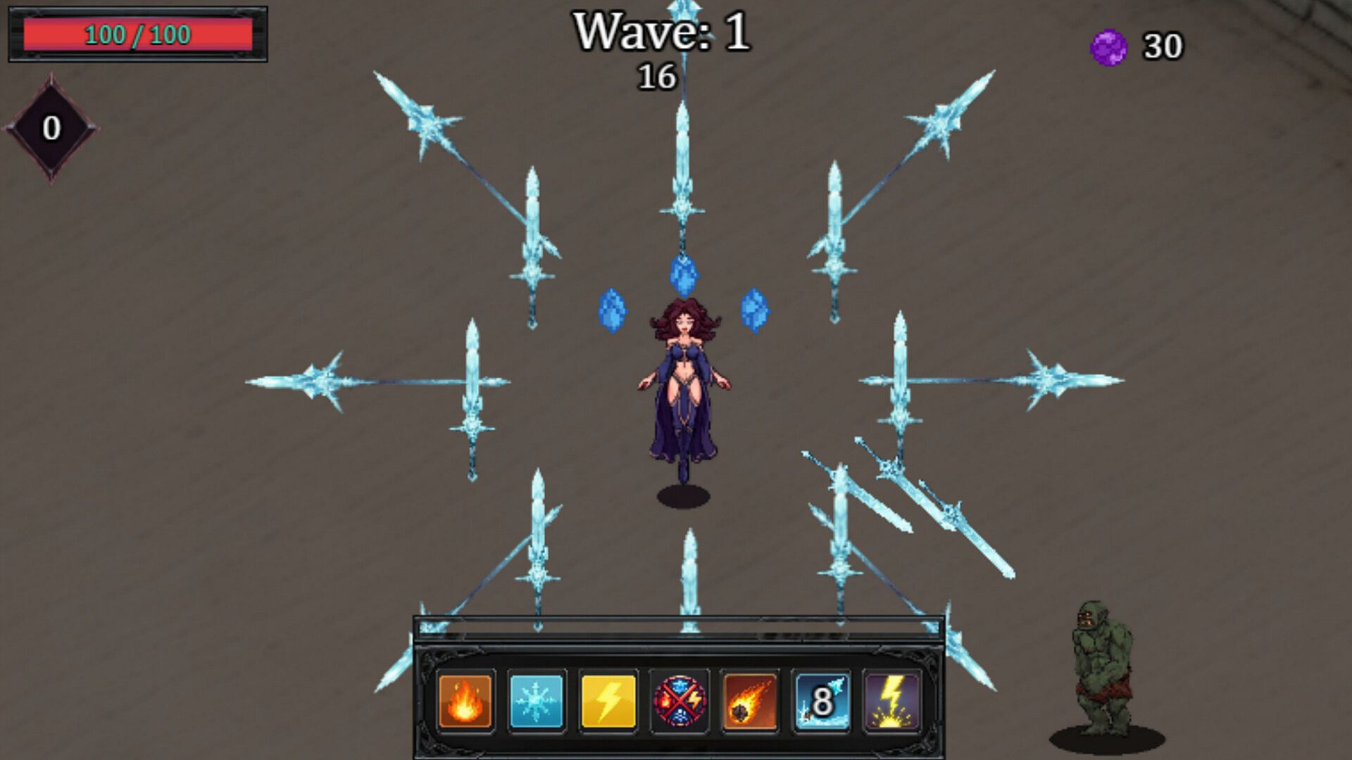 • Ice: Slows down enemies and can form deadly Ice Swords & Ice Spears.