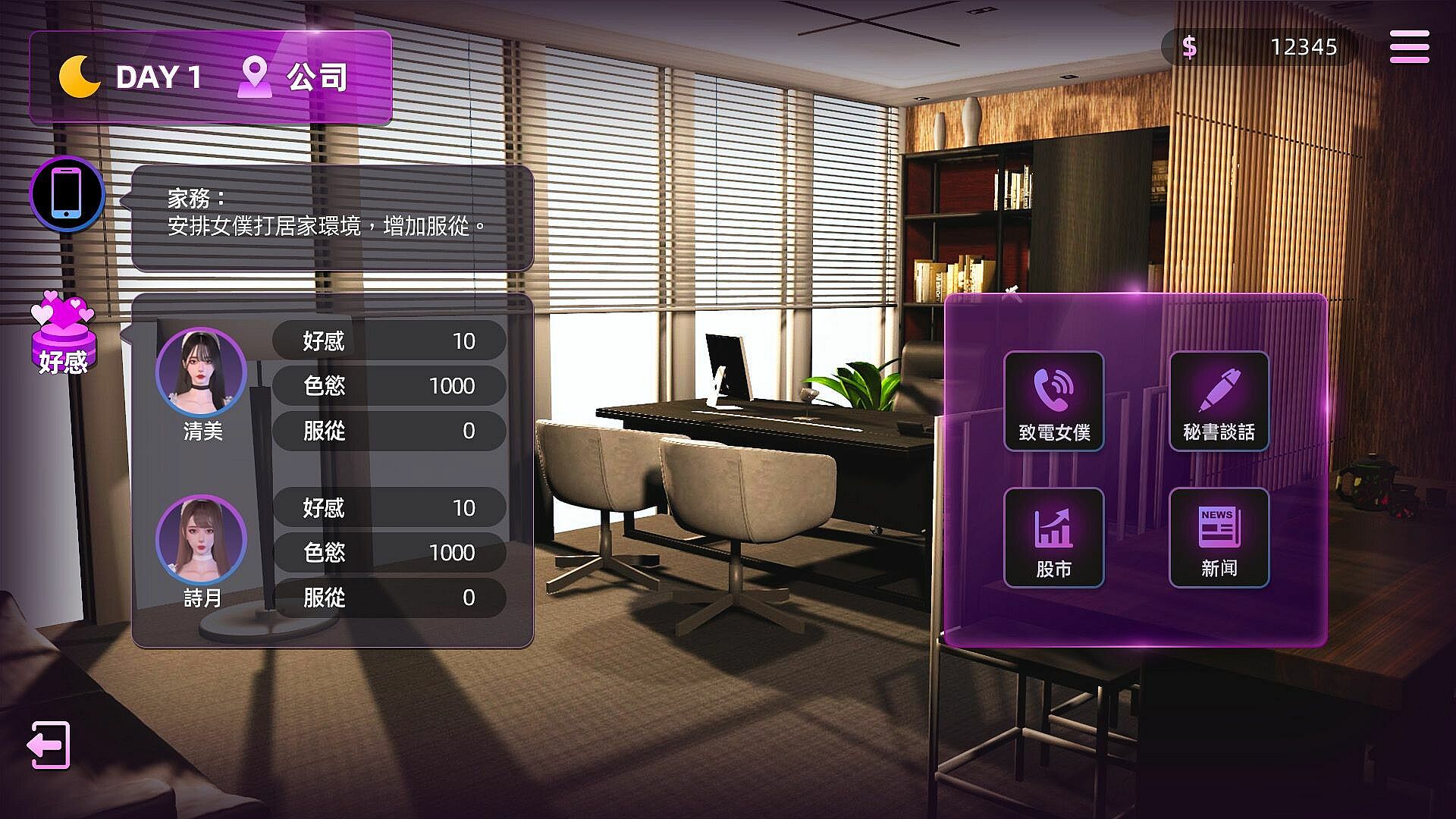 ◇ You can arrange work for the maids every morning. When you are at work, you can choose to interact with the maids, the secretary, or trade stocks; in the evening, you can choose whether to go out or stay with the maids in the villa and spend a ♀sweet♂ night.