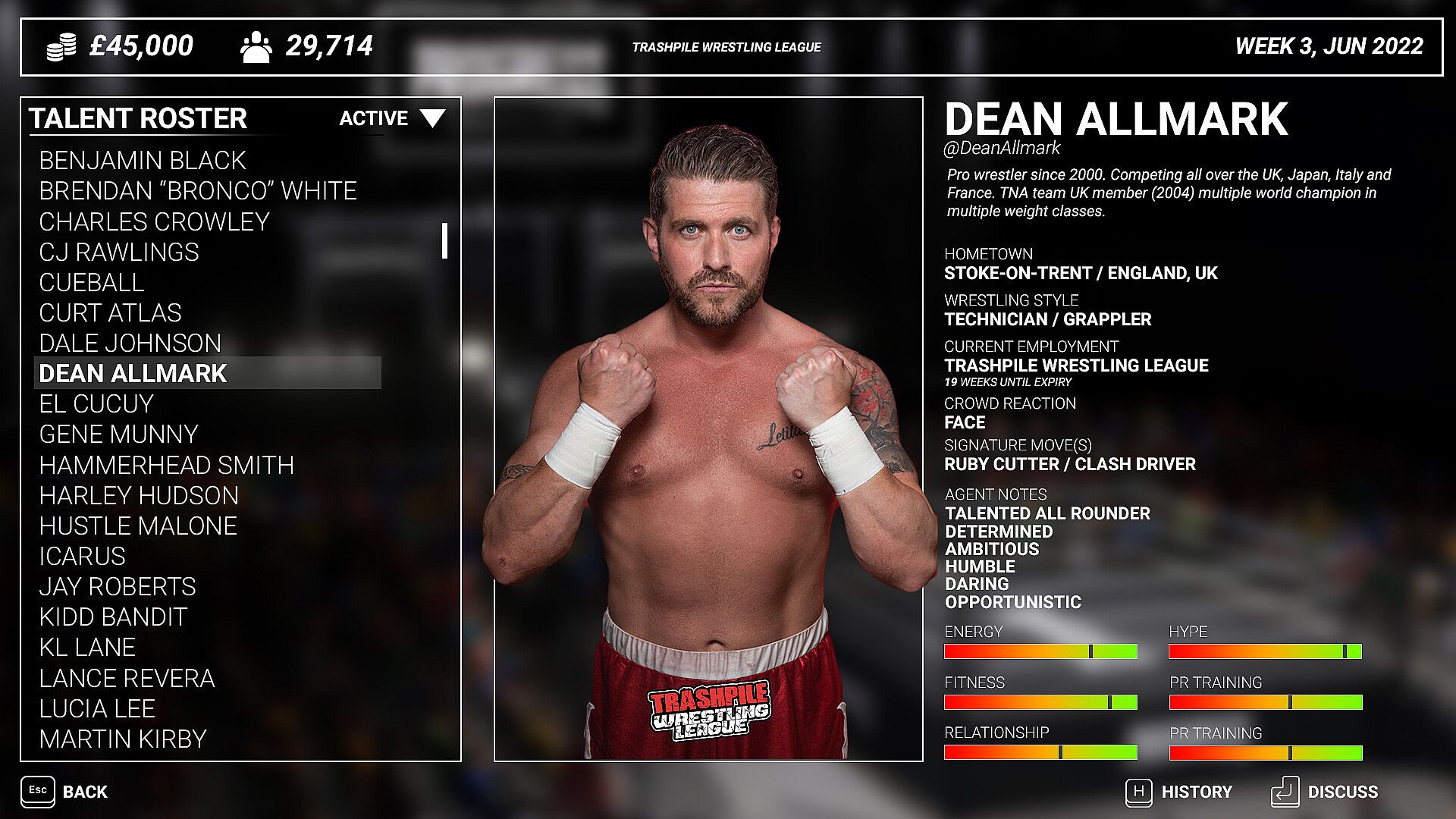 Create your promotion from the ground up, starting with your promotion profile and your company branding. Start your journey with your first few shows to establish yourself in the wrestling world, find your target audience, and gain public attention.
