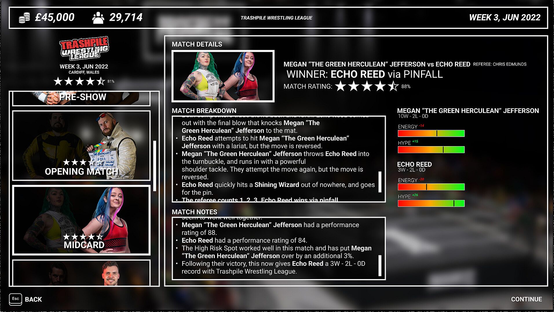Post match analysis will show you what worked, and what didn't, with the ability to see the talent's progress with the company, how over they were with the crowd, as well as how well the event did in general.