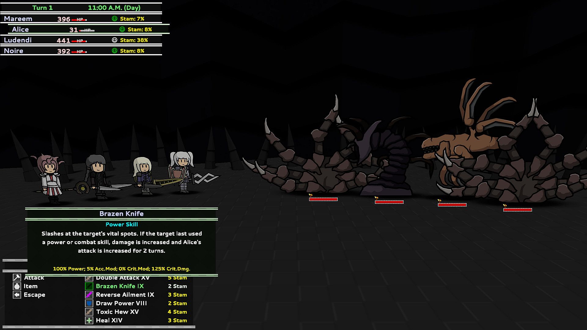 For resources, Majula Frontier uses stamina. Stamina starts at 0, and whenever a character uses a skill or is hit by an enemy skill, their stamina increases. As their stamina reaches certain thresholds, their damage decreases, the damage they receive increases, and their chance of resisting a fatal hit decreases. There are very few ways to recover stamina during a mission, so in order to survive it’s critical that you optimize your skill usage.