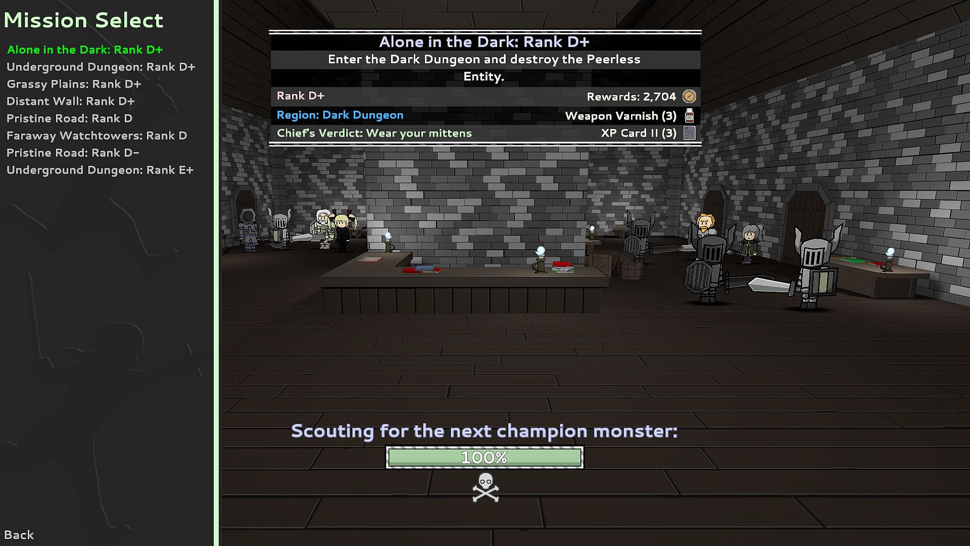 For each mission, you take 4 characters (out of the 20 available) into a dungeon and fight monsters. The goal of each mission is usually to kill a certain number of monsters, rescue missing people, or defeat a powerful boss monster.