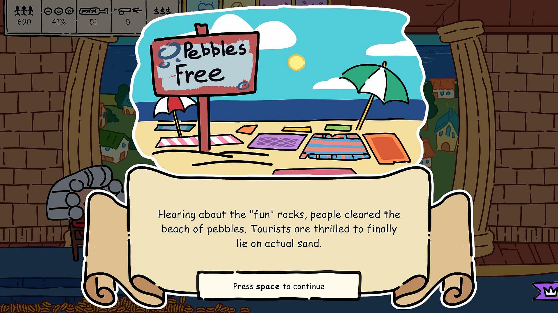 Your decisions bring not only chaos but also valuable resources. Spend them wisely to turn a quiet harbor into a thriving, eccentric dream island!