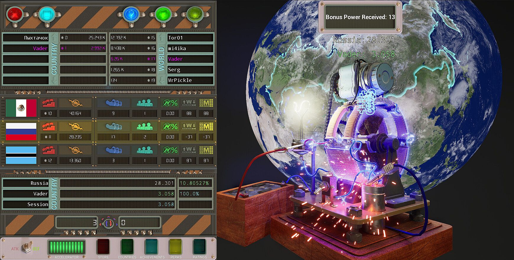 Our project offers you a fair way to compete with all the players on the planet for the ranking of countries in the global leaderboard.