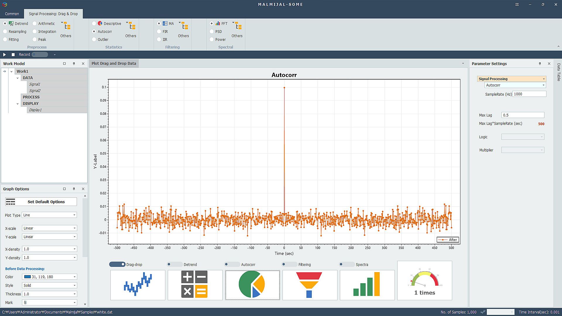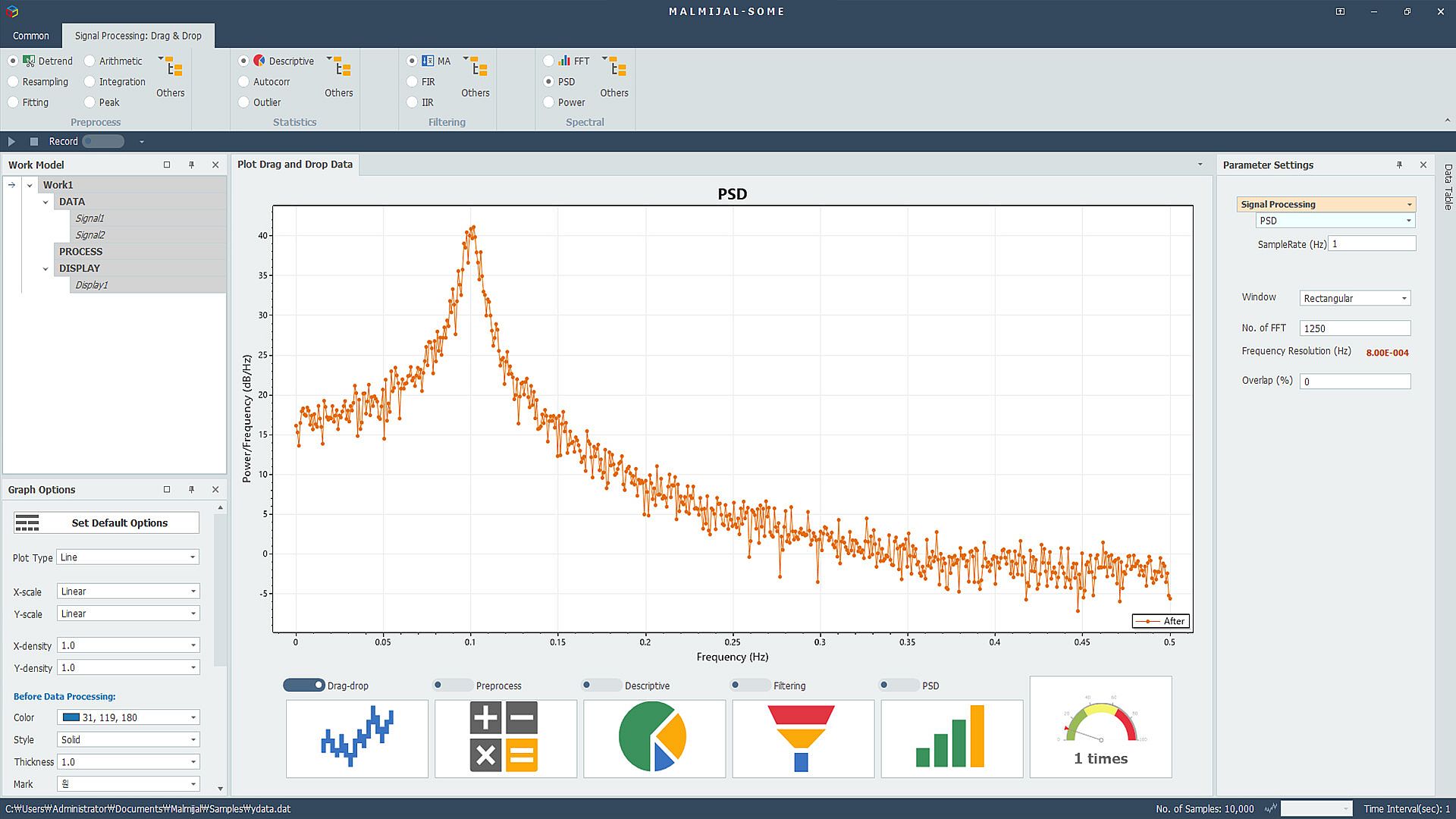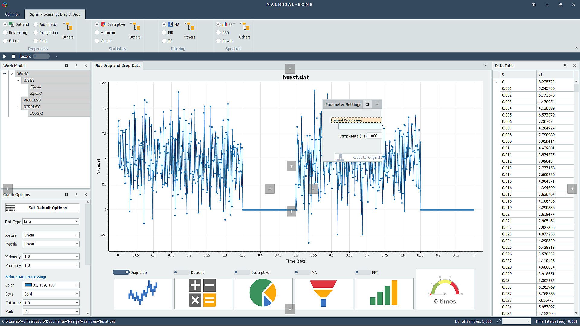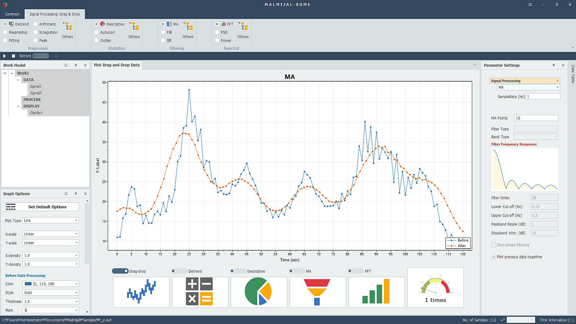 MALMIJAL is a platform that can process various data in a drag-and-drop method. Based on data visualization, MALMIJAL processes results by dragging and dropping or clicking pre-processing, statistical processing, filtering, spectral analysis, etc. You can visualize it as a graph or save it as a file.