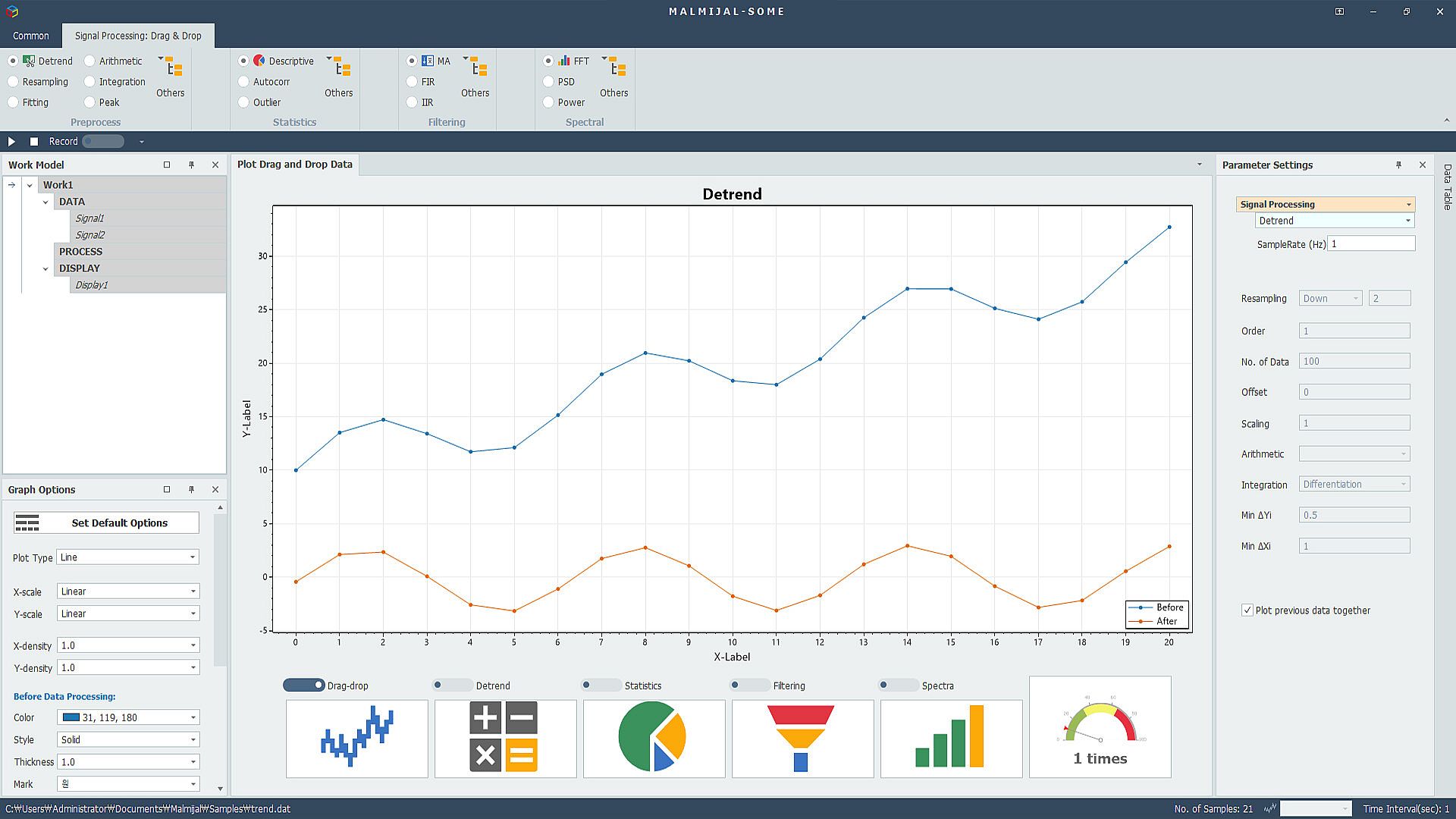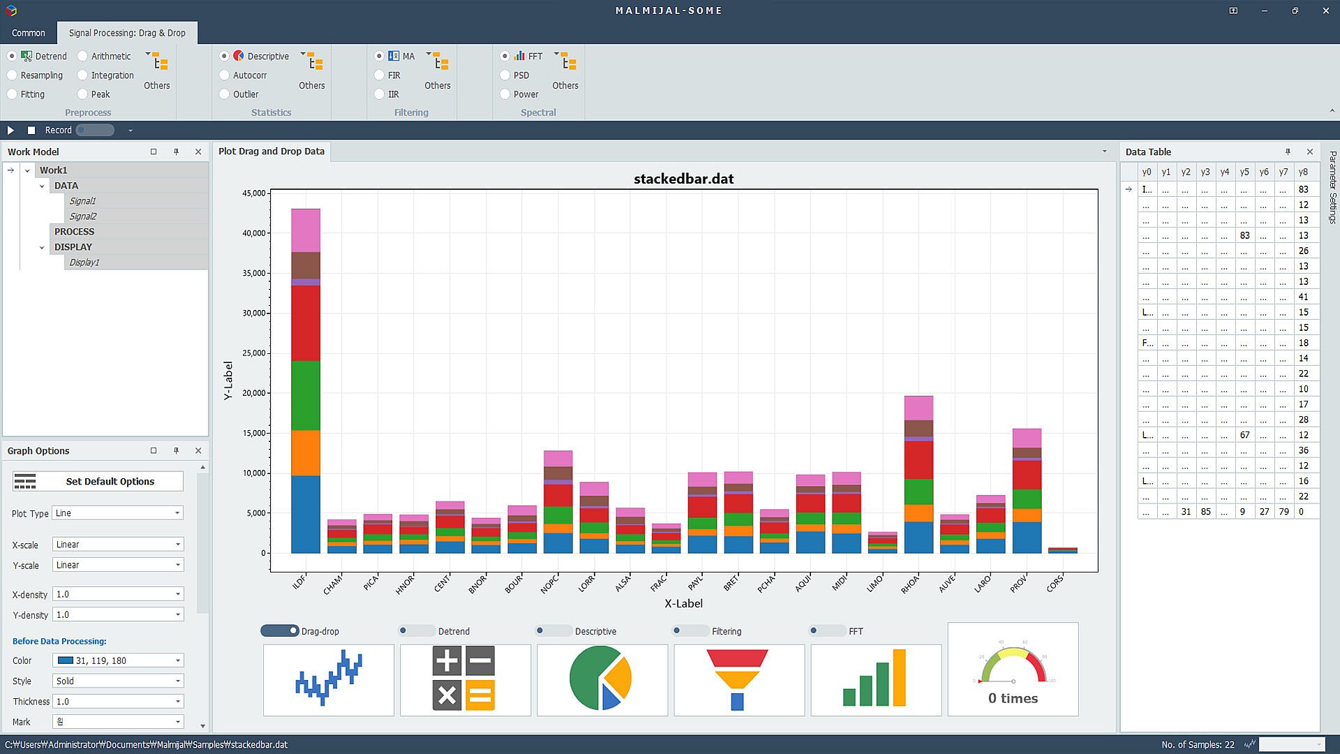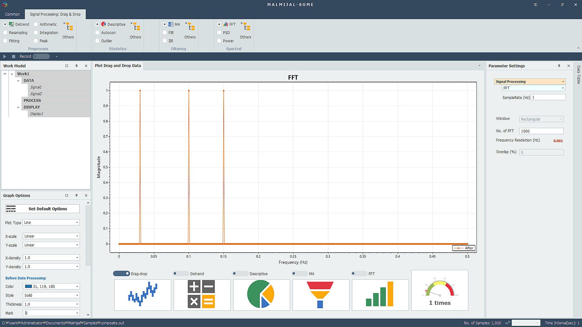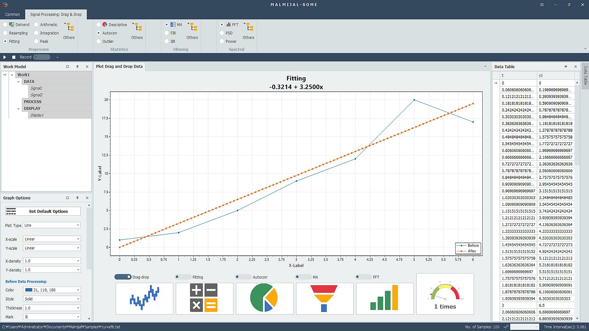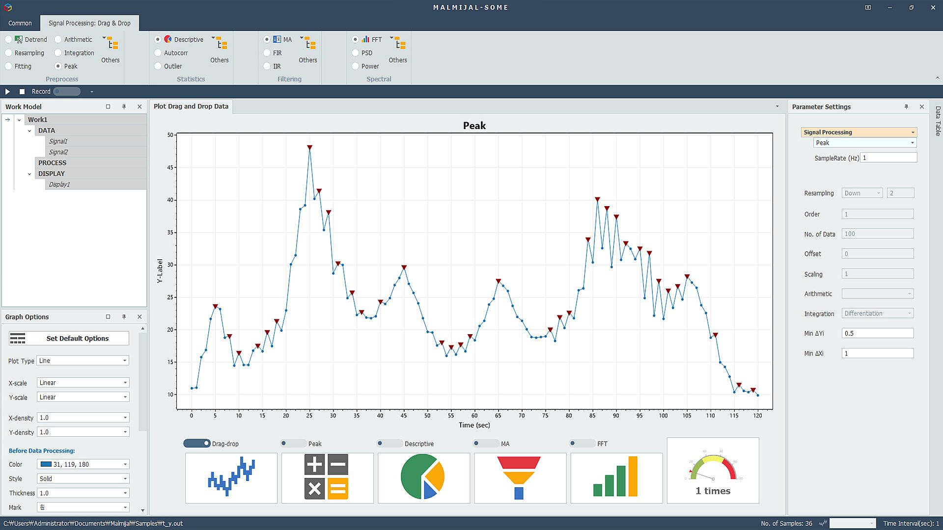 MALMIJAL is a platform that can process various data in a drag-and-drop method. Based on data visualization, MALMIJAL processes results by dragging and dropping or clicking pre-processing, statistical processing, filtering, spectral analysis, etc. You can visualize it as a graph or save it as a file.