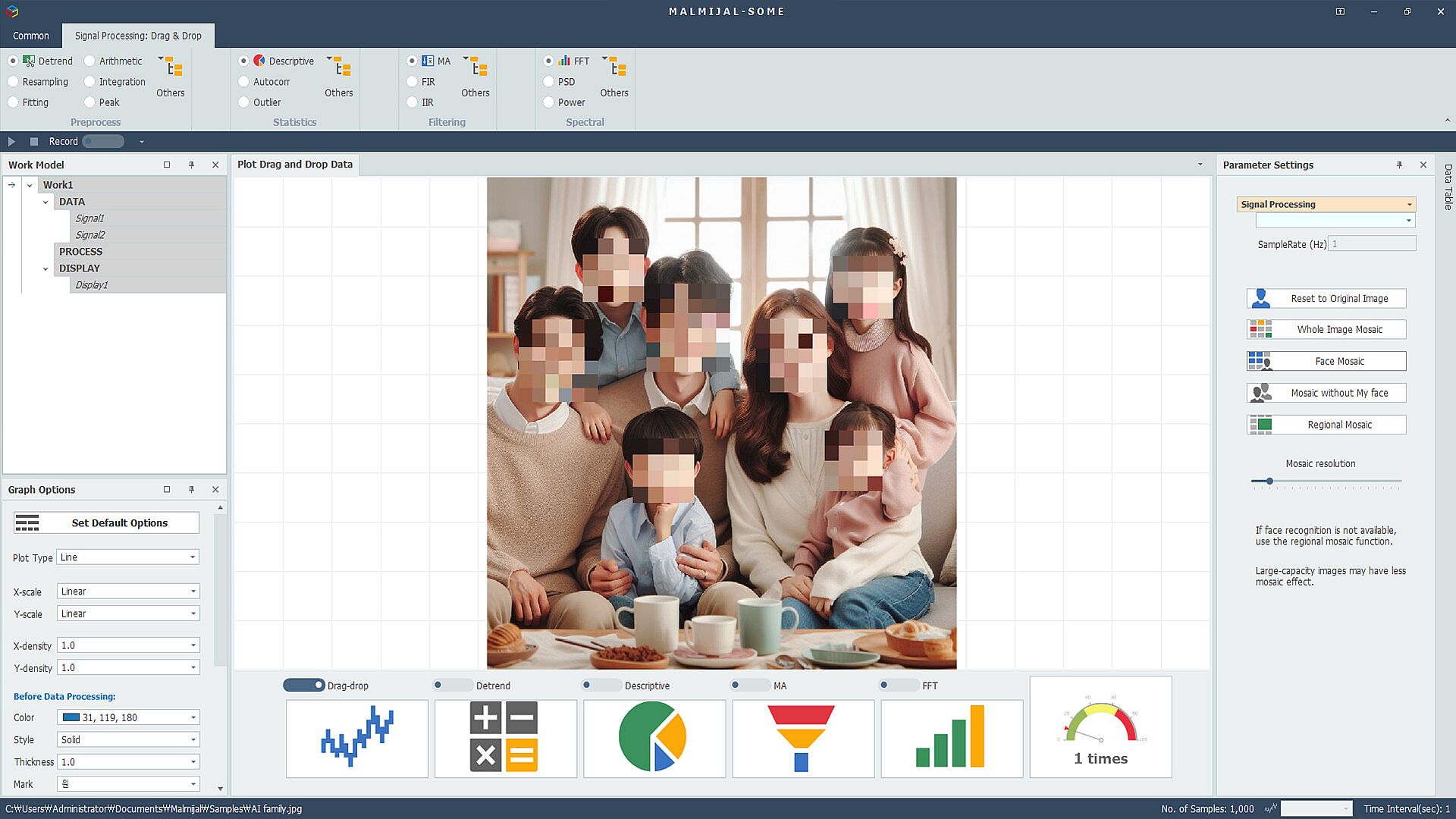 Files that can be visualized or analyzed are MATLAB numerical binary files (*.mat), Excel (*.xlsx), various audio files (*.wav, *.flac, *.mp3, ...) and text files. For graphs, depending on the data type, they are automatically displayed as bar graphs, pie graphs, or line graphs, and if they can be transformed, the graph display can be transformed, You can adjust the marker shape and size, line style, line color and thickness, and use the data cursor to know the current data value. For image files, mosaic function is possible, and only the rest of you can mosaic your face except me.