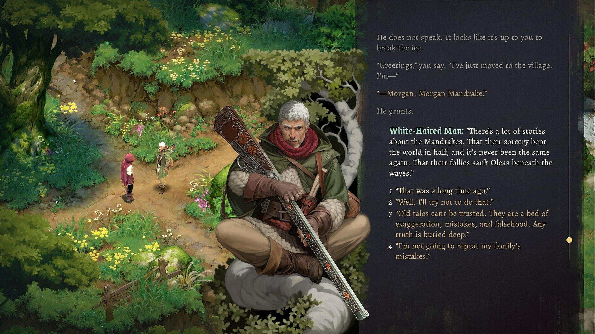 Magic in Mandrake isn't about flashy fireballs and shimmering shields, but about folkloric ingenuity, whimsy and patience. Grow a cherry tree from seedling to maturity in seven days rather than seven years, then fashion your sorcerer's staff from its wood. Befriend a river. Eavesdrop on the dead. Spend a haunted night at the Butcher's Oak. Drink tea with the god who lives in your chimney.Â