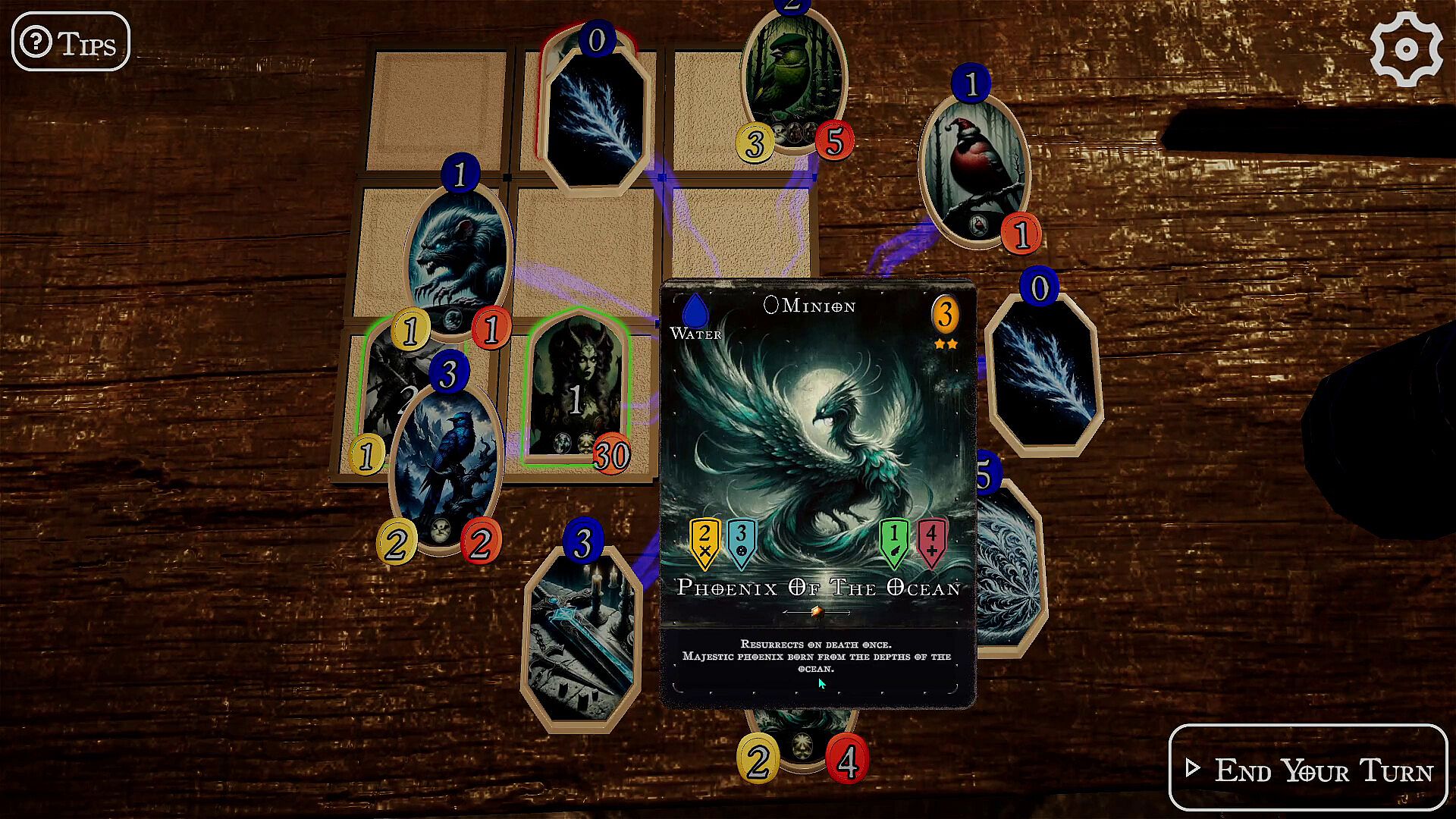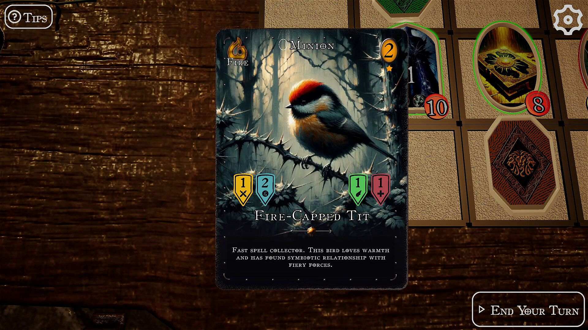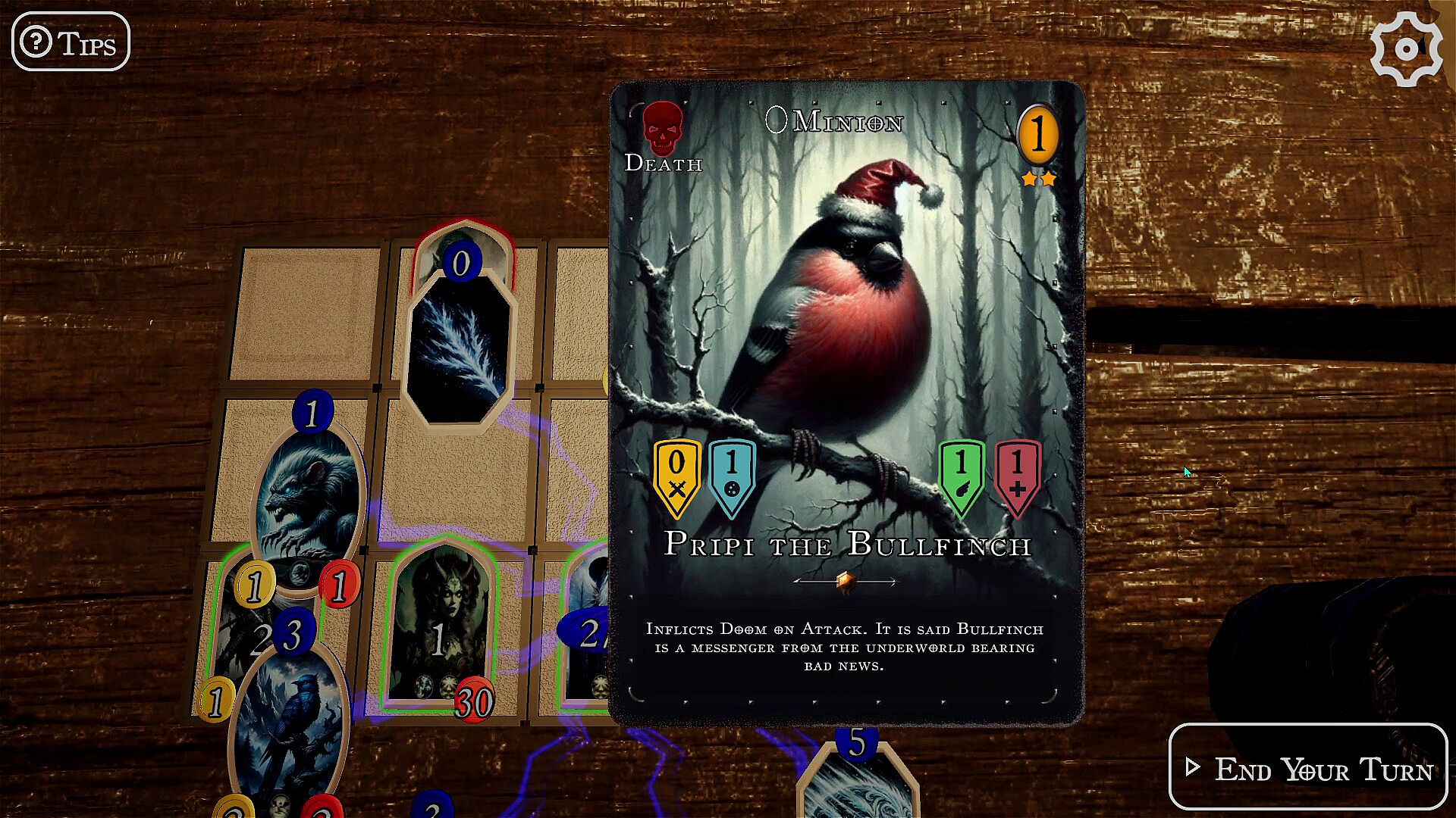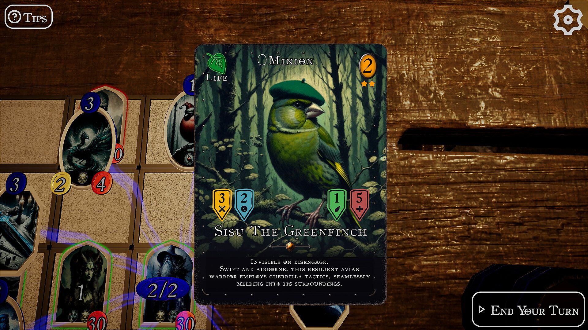 Cards have levels (1-10) and tiers (1-3). Enhanced tier cards wield inherent effects or abilities right from the start. Consider Tier 2 card: the bullfinch, for instance. Devoid of attack power or health, it carries the ominous message of doom. A minion inflicted by Doom faces certain destruction within two turns, regardless of its health or protective measures. Notably, the doom effect does not extend to heroes, rendering it both an immensely powerful and fragile card at the same time. While it succumbs easily to a variety of spells or even the feeblest minion card, failing to do so might spell the demise of your most formidable minions. The aim of this design is that at Tier 1 the game is quite simple but gets more complex and difficult as tiers increase.