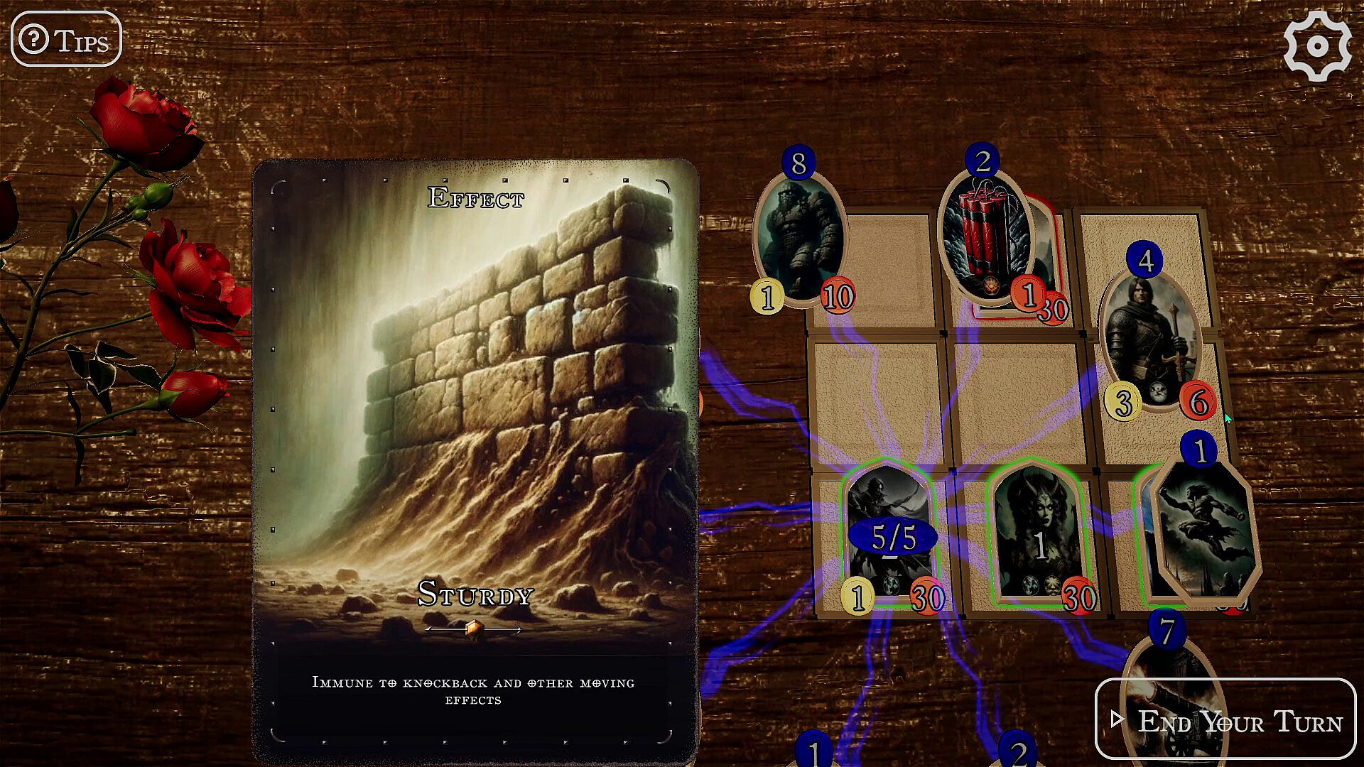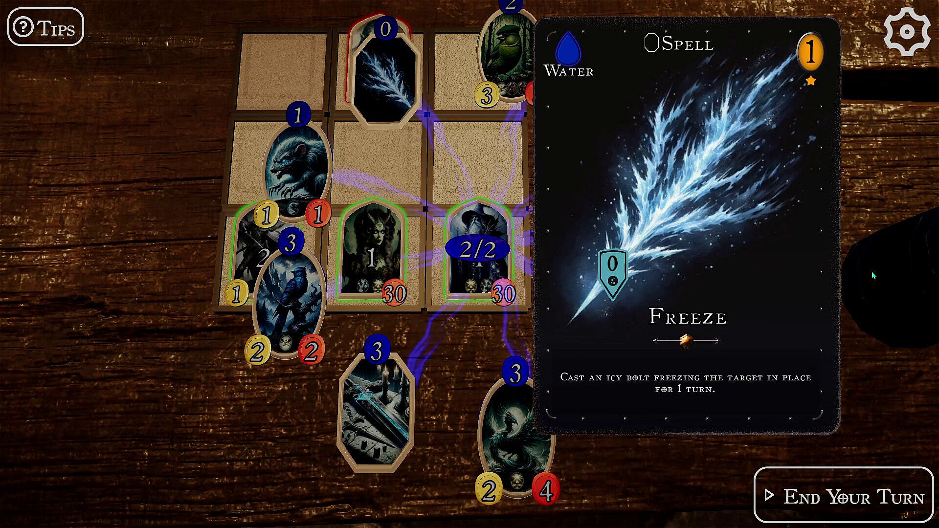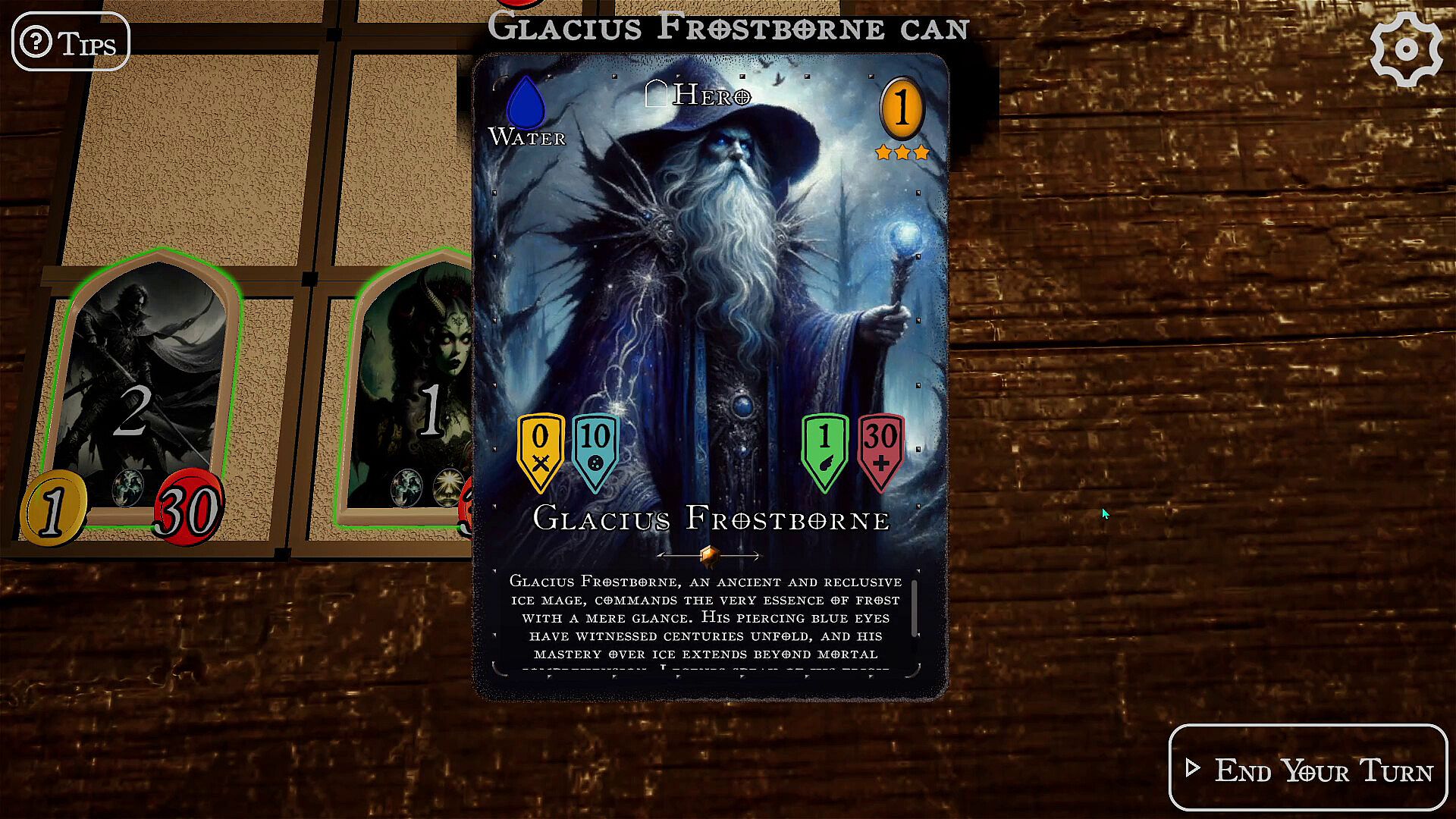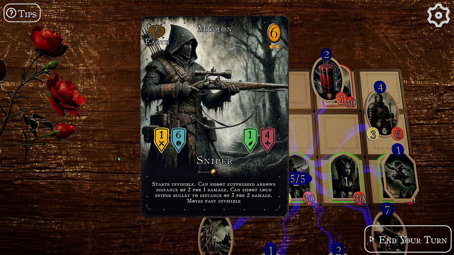 Cards have levels (1-10) and tiers (1-3). Enhanced tier cards wield inherent effects or abilities right from the start. Consider Tier 2 card: the bullfinch, for instance. Devoid of attack power or health, it carries the ominous message of doom. A minion inflicted by Doom faces certain destruction within two turns, regardless of its health or protective measures. Notably, the doom effect does not extend to heroes, rendering it both an immensely powerful and fragile card at the same time. While it succumbs easily to a variety of spells or even the feeblest minion card, failing to do so might spell the demise of your most formidable minions. The aim of this design is that at Tier 1 the game is quite simple but gets more complex and difficult as tiers increase.