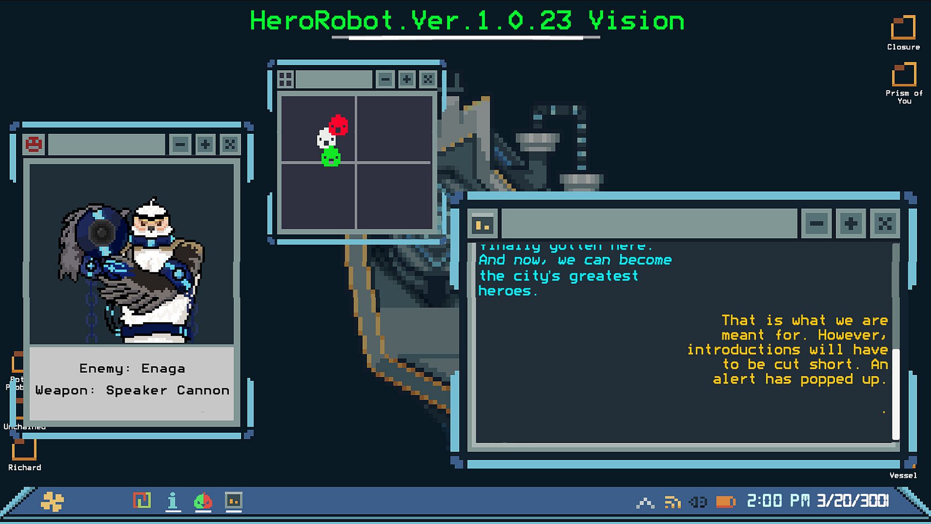 Mantle is a 2D first-person narrative superhero simulation game with turn-based puzzle-like combat. Face off against a wide host of heroes and villains! Witness headlines in the news that respond to your actions as a superhero robot in a proud and egotistical world.
