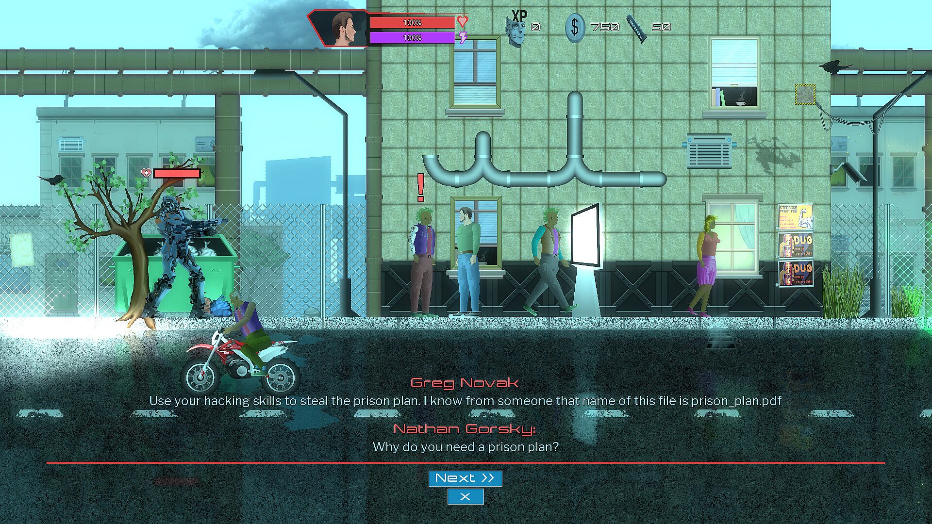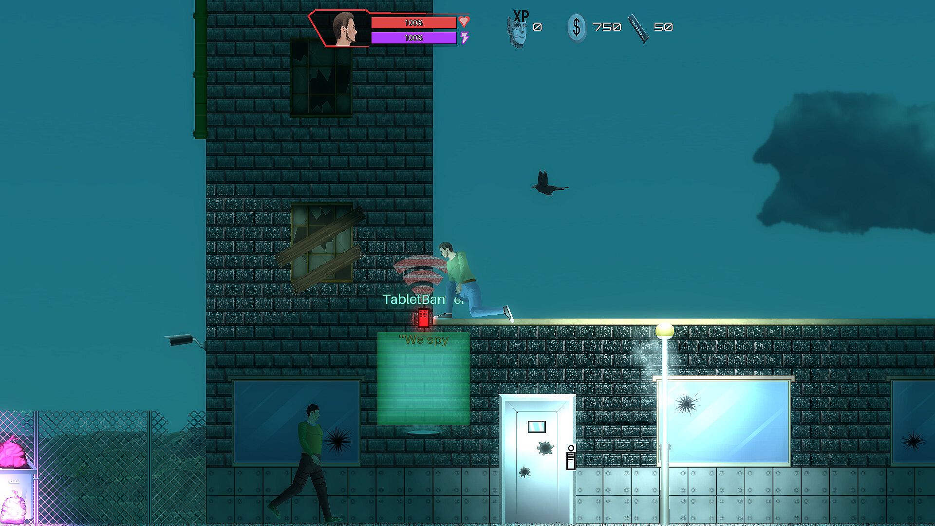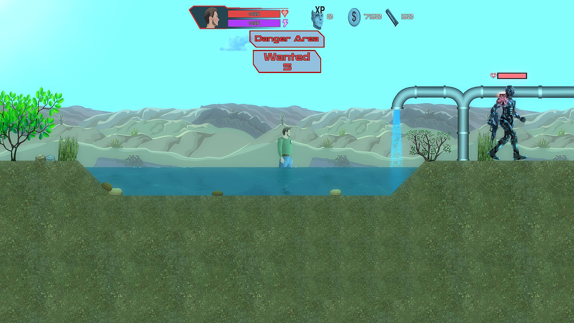 A 2D platformer set in a dystopian future where corrupt governments and corporations rule, and people are implanted with a small electronic chip (microchip) to control them. People who aren't microchipped are excluded from society—they're poor and homeless. Furthermore, governments and corporations use robots to maintain order in society. You, as a lone hero, oppose this and try to combat government propaganda, social control, and exploitation.