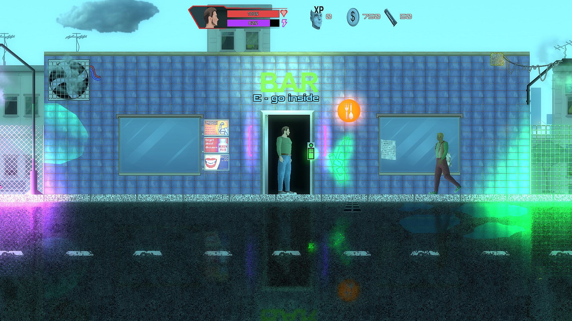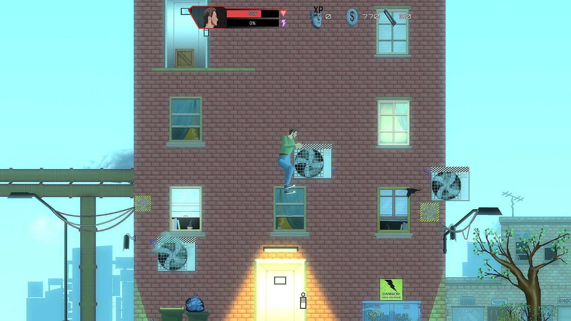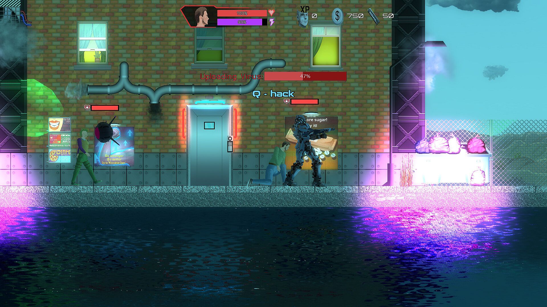 A 2D platformer set in a dystopian future where corrupt governments and corporations rule, and people are implanted with a small electronic chip (microchip) to control them. People who aren't microchipped are excluded from society—they're poor and homeless. Furthermore, governments and corporations use robots to maintain order in society. You, as a lone hero, oppose this and try to combat government propaganda, social control, and exploitation.