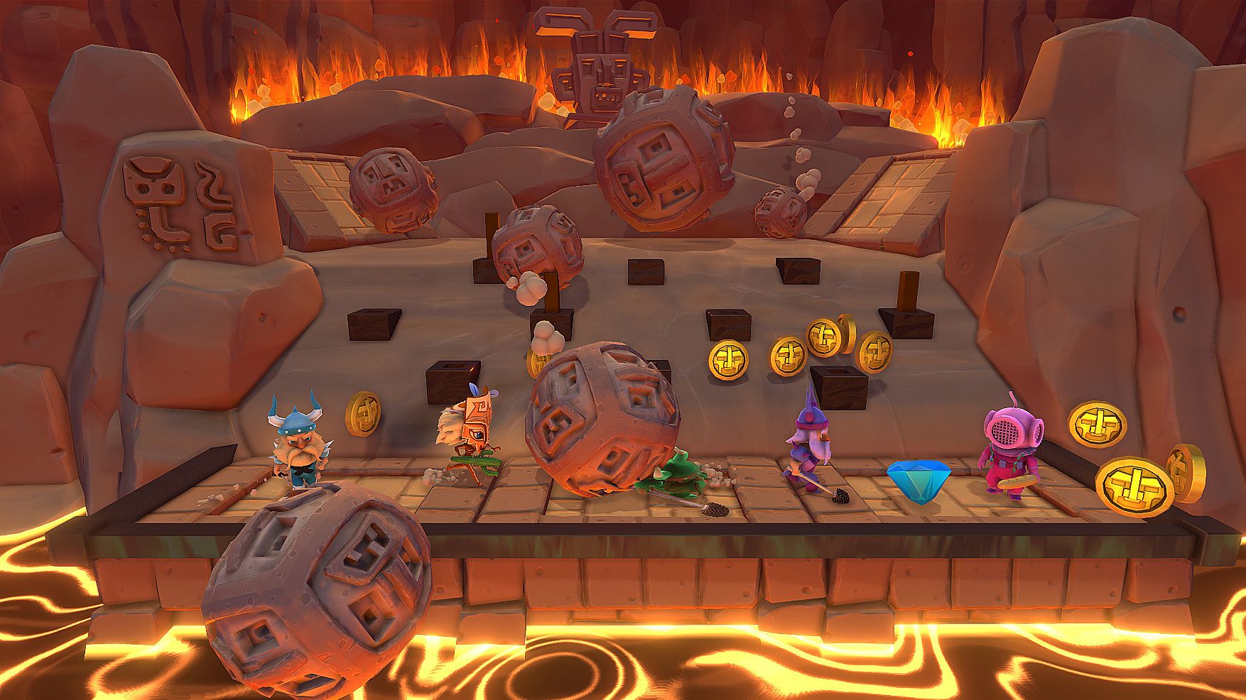 As well as Party Mode, you can challenge your friends in Arena Mode to see who's the king of the ring! Battle it out across 12 different locations, and expect to stumble upon fresh new chaos from time to time in the form of a hidden game mode or two! Expect the unexpected, and die... we mean WIN in extreme ways! What are you waiting for, there's treasure out there!