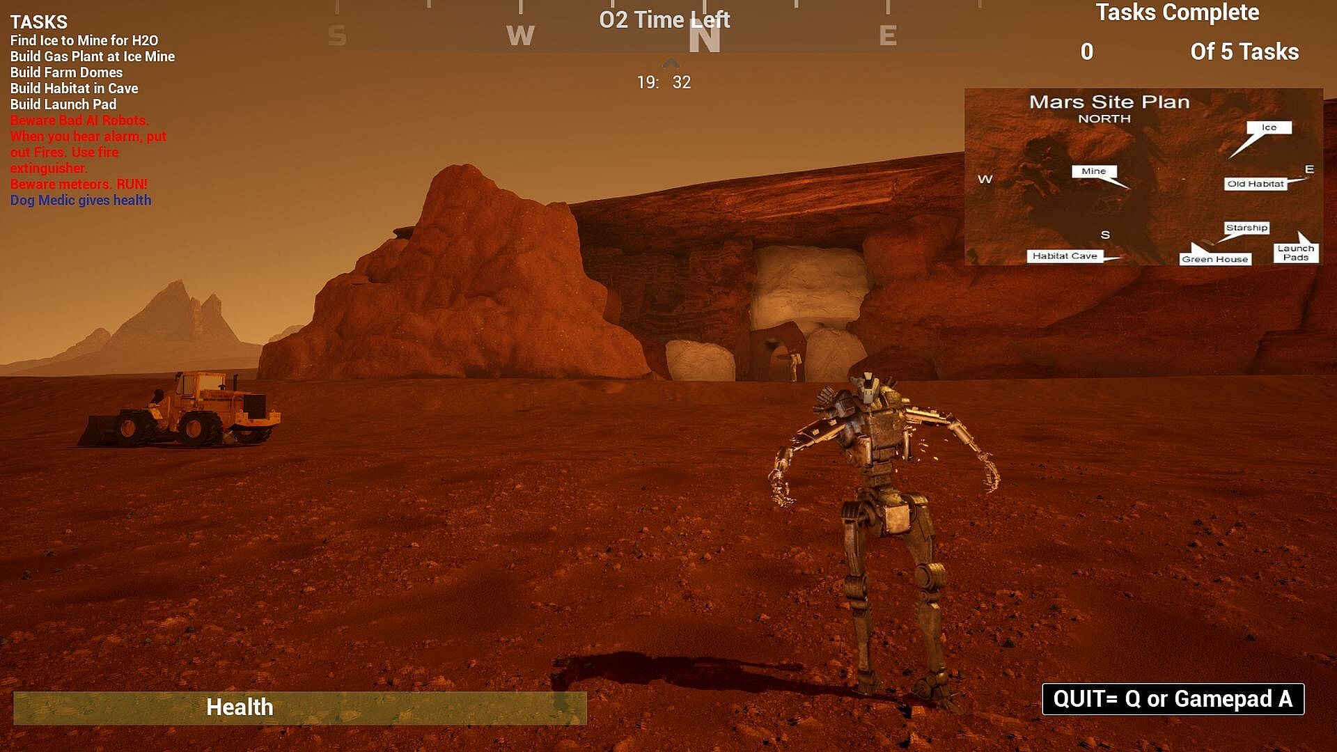 Mars Training Camp is a simulation of building the first human base on Mars. It is based on the actual science, plans and proposed technologies of NASA, SpaceX and international partners for the future Mission to Mars. The player meets their team, explores the Starship and Mars landscape by walking or driving a Cyber truck. Player must find ice for oxygen to breathe and hydrogen for rocket fuel, and must build critical facilities. Player must respond to emergencies of fire, low supply of oxygen, meteors, tornadoes and malfunctioning humanoid robots with bad AI.