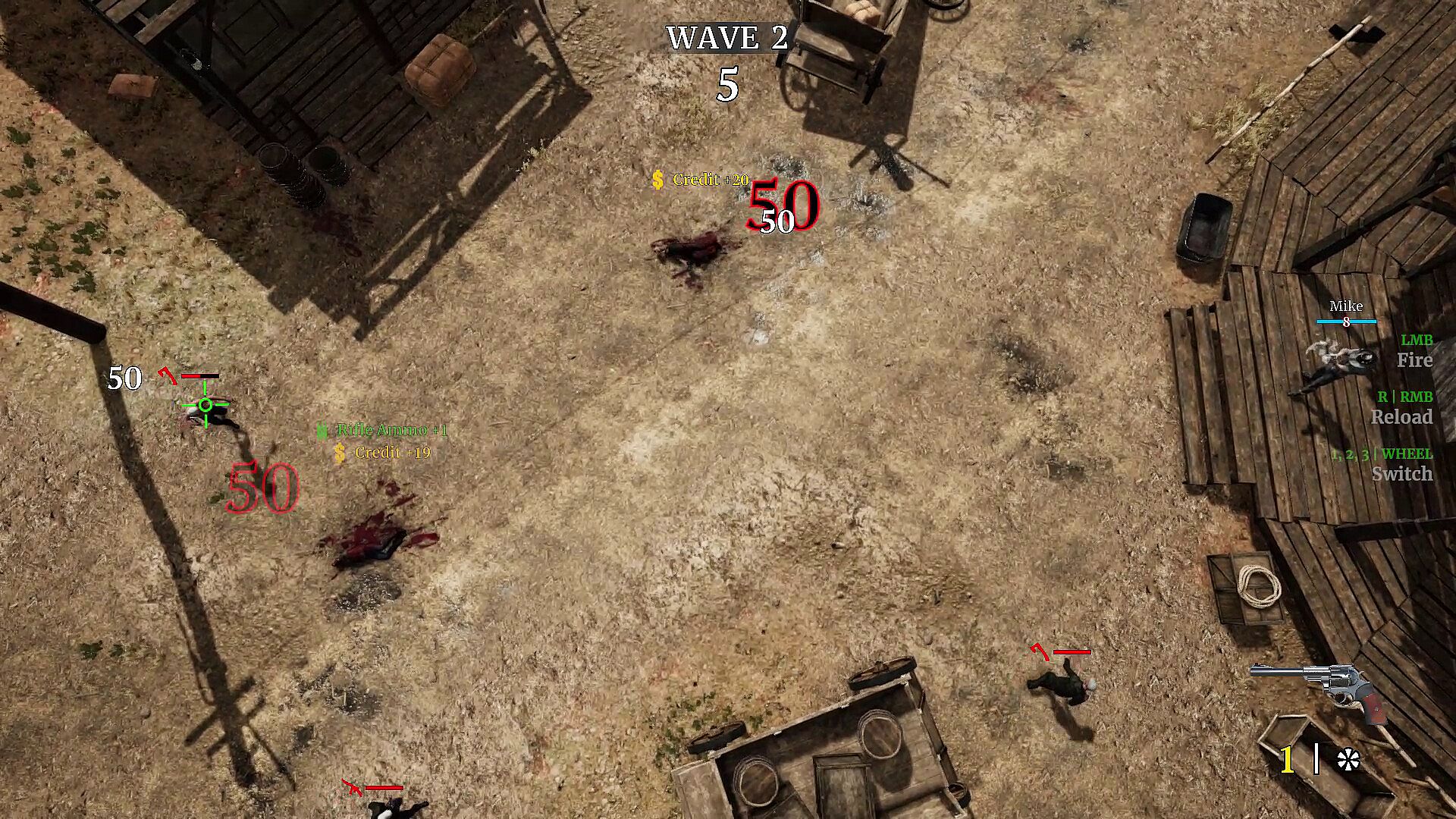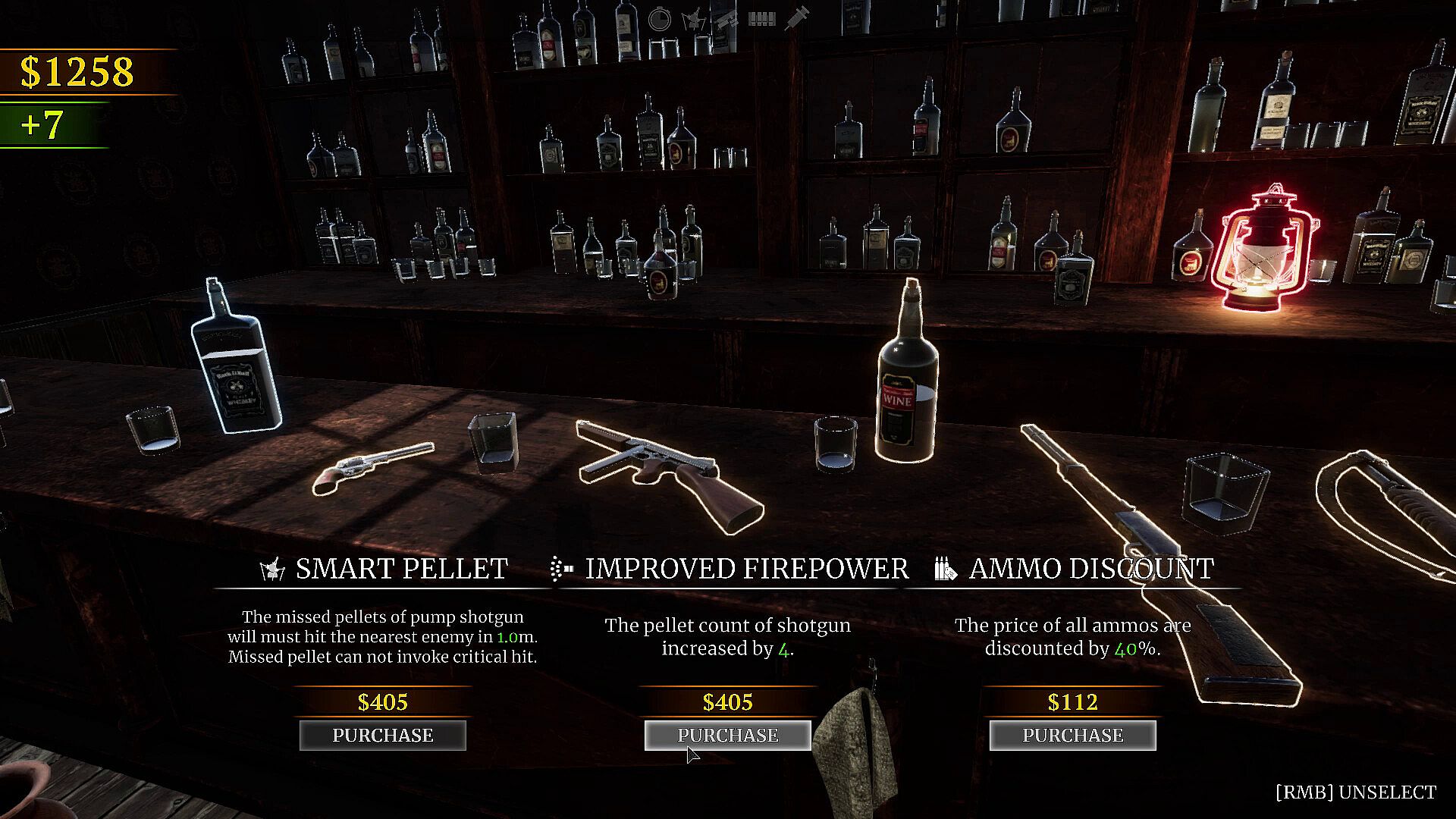 - After wave end, moving to saloon. You can use the credits to buy ability, upgrade the weapons and recover the health