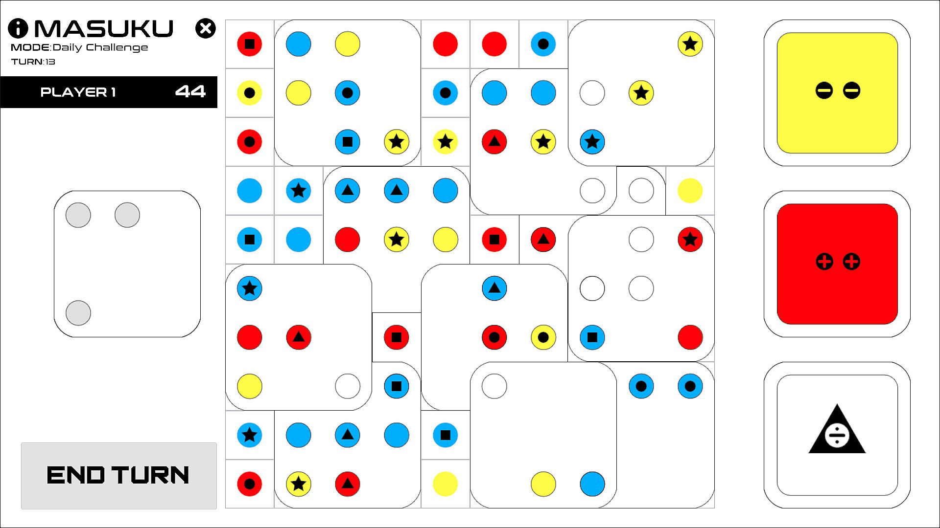An abstract strategy game of clever placement and calculated risk. Place and rotate cards to reveal colours and symbols that match ever-changing scoring goals.