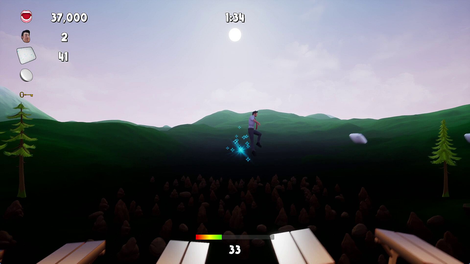 Exact jump timing is required to jump over many multi-pickups that are placed beside each other.