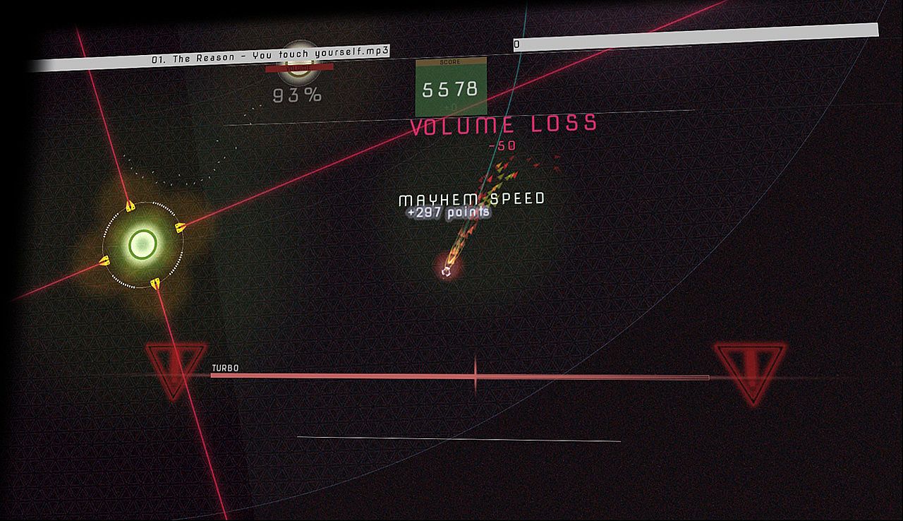 Mayhem Above is a Music Gravity Score Attack game. You are an International Space Speaker. Musical impulses are analyzed from the songs you select. Each Music impulse will give you a turbo boost that will allow you to perform more tricks and gain more score. But beware! The more musical intensity, the more enemy activity. And they will try to shut you up.