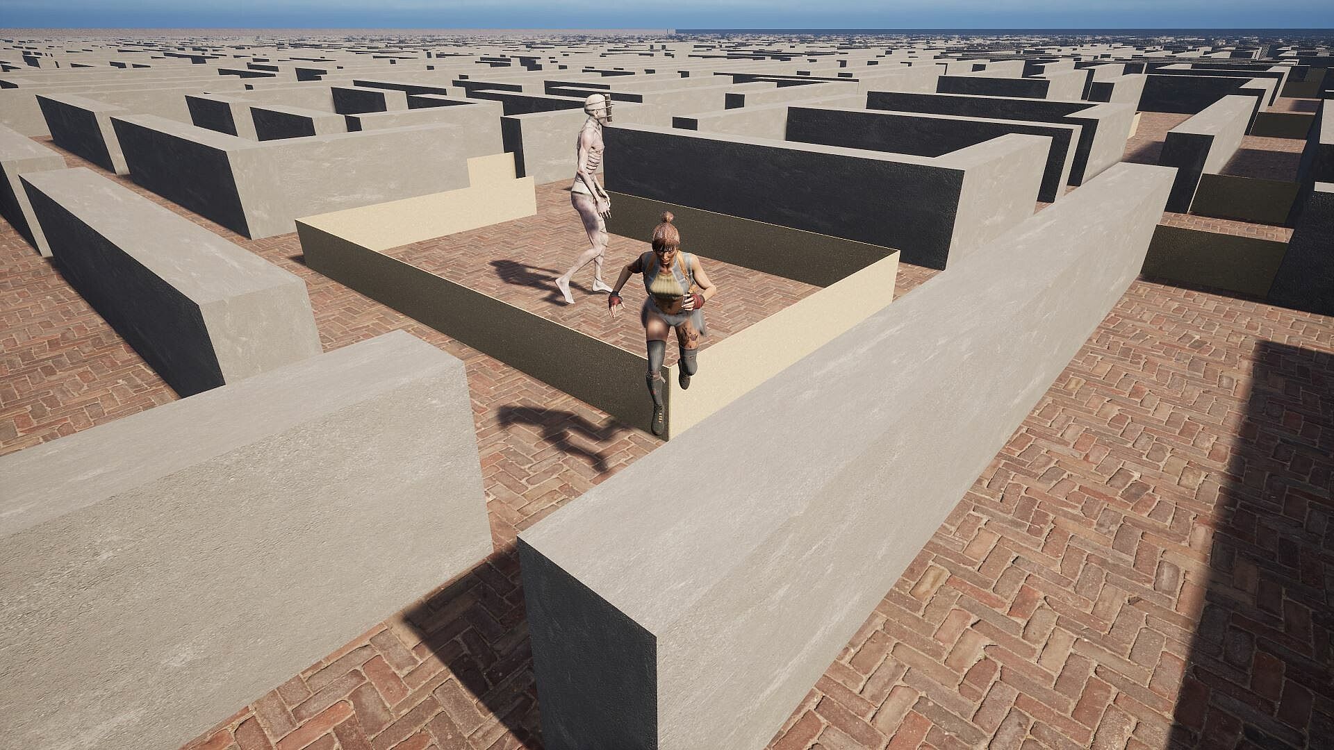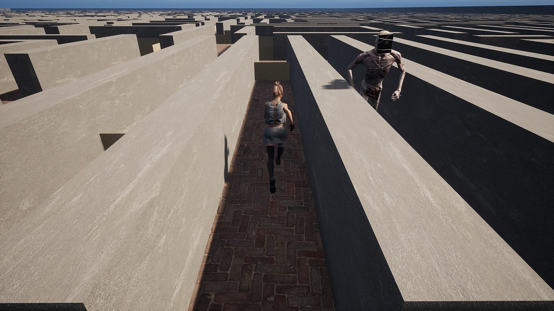 A maze chase game. A monster is chasing the player, and the player needs to keep running, jump over the guardrail, avoid being caught by the monster, and gradually find the maze exit and escape the maze.