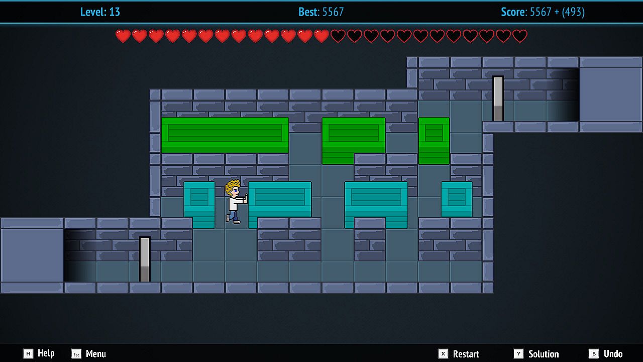The goal is to get the character from the left side of the room to the right side by pushing rows of blocks.