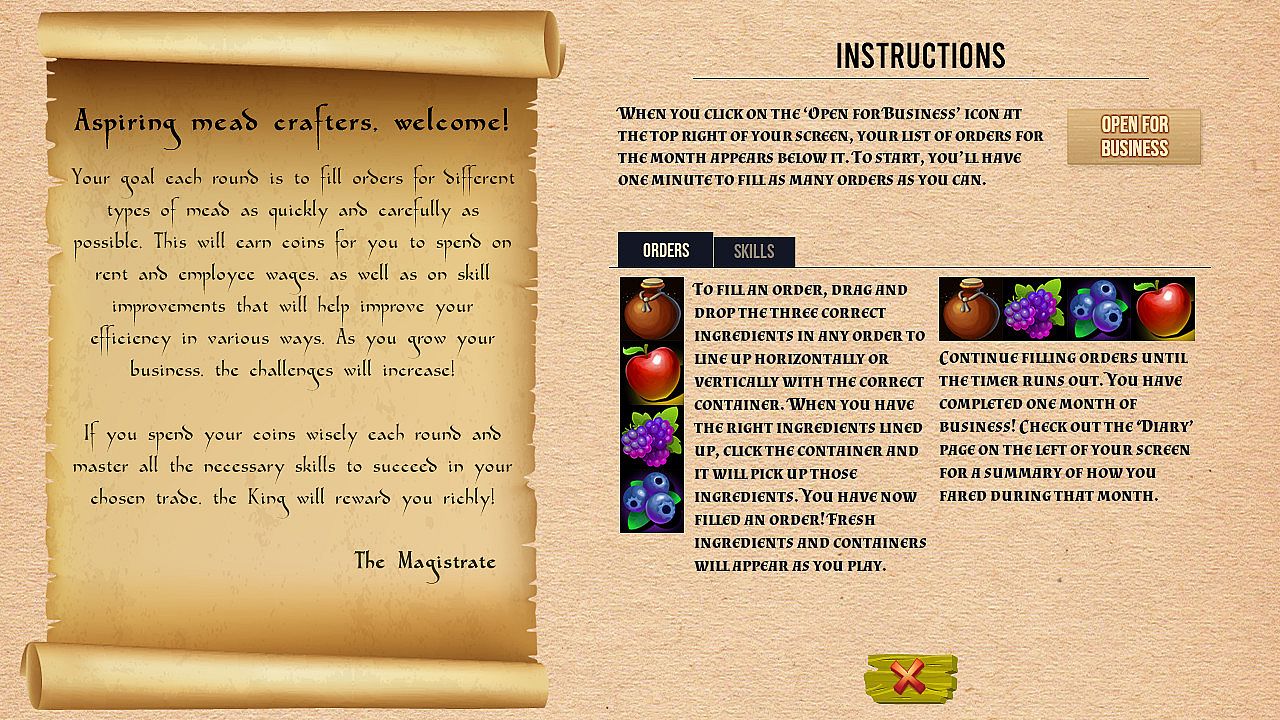 Start your career as a humble maker of mead, the delicious honey-based drink that has been popular throughout human history in Europe, Africa, and Asia. Click colorful icons to fill your customer’s orders for different types of mead flavored with various fruits and spices. Don’t forget to follow the recipe correctly and to place each order in the proper container! Earn coins every round to cover monthly rent costs or buy various skill improvements that help you grow your business.