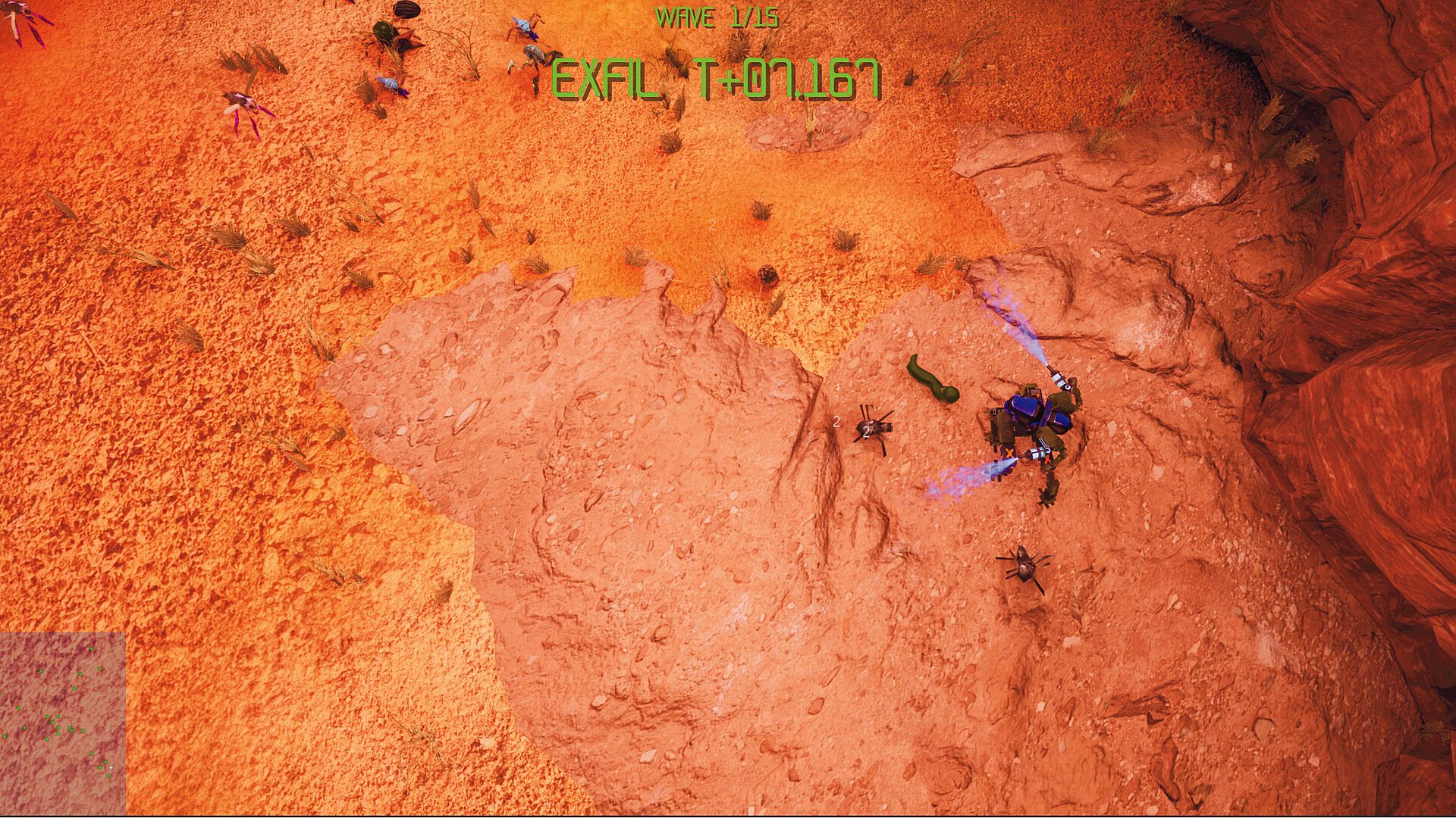 The game's third-person top-down perspective puts you right in the center of the action. Insectoid enemies will relentlessly rush you in melee waves, each one tougher than the last. With your piloting skills and strategic mindset, you'll maneuver your mech, hold your ground, and collect precious loot from your defeated enemies.